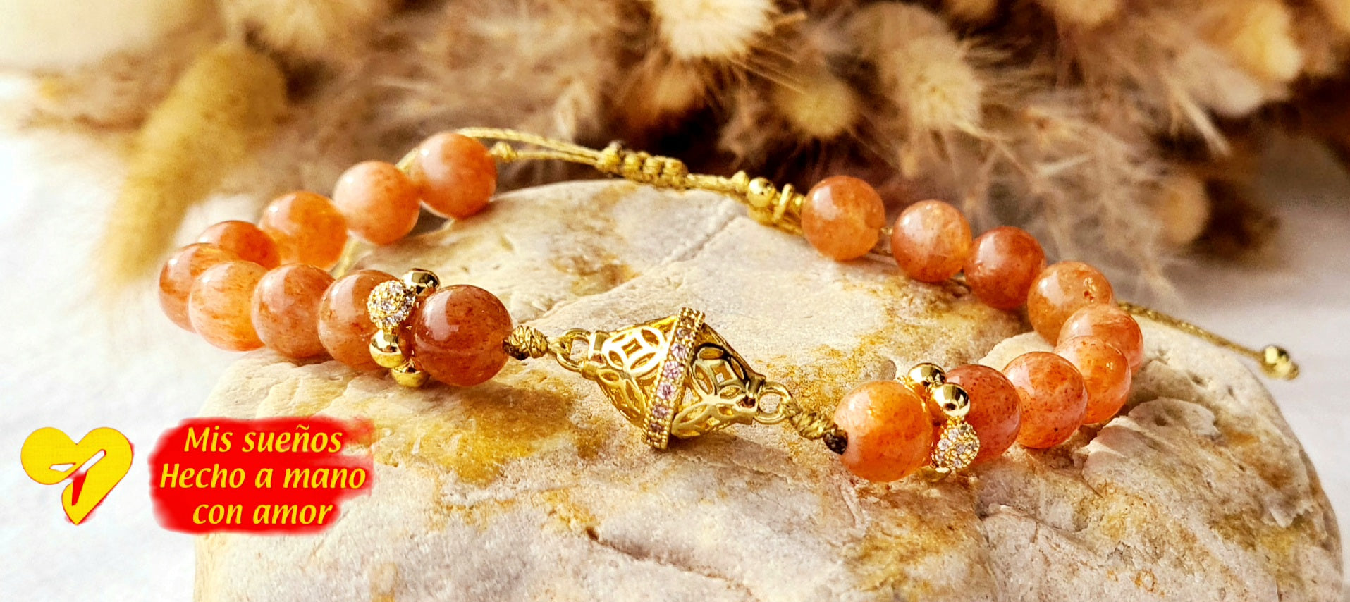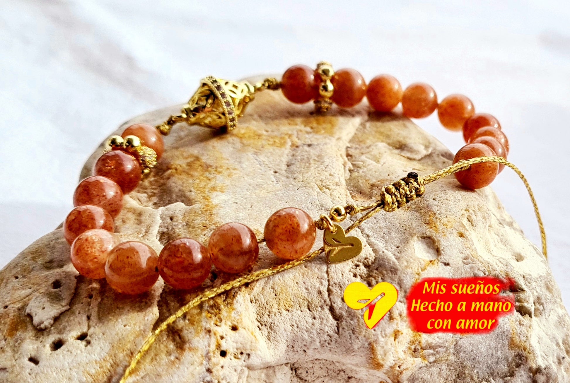 Ein wunderschönes Armband aus "Sonnenstein" Naturstein-Perlen (8mm), die mit einem wunderschönen Verbinder verbunden und von ganz tollen Spacern geziert werden. Sie bestehen aus Messing 18 Karat vergoldet und enthalten kleine Zirkonia Steinchen. Die Maße sind hier ca. 19cm, der Preis kann je nach Größenanfrage variieren. Sie sind auf hochqualitativ goldenem Makramee-Garn aufgefädelt und mit einem Makramee-Zugverschluss versehen.