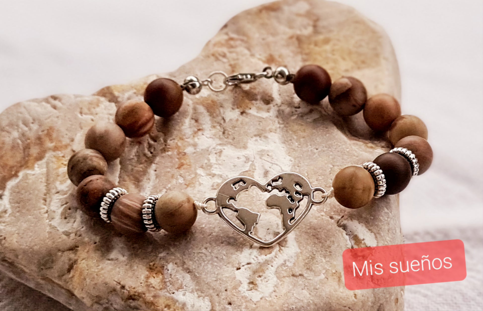 Das elegante Armband ist mit wunderschönem "versteinerten Holz" Naturstein-Perlen (8mm) besetzt, die mit einem Welt-Herz aus Metall (Zamak) verbunden sind. Die silbernen Trennscheiben aus Metall (Zamak) runden dieses tolle Armband ab. Die Maße sind hier ca. 19cm, der Preis kann je nach Größenanfrage variieren. Sie sind auf hochqualitative Perlseide aufgefädelt und mit einem hochwertiger Karabiner-Verschluss 925 Silber versehen.