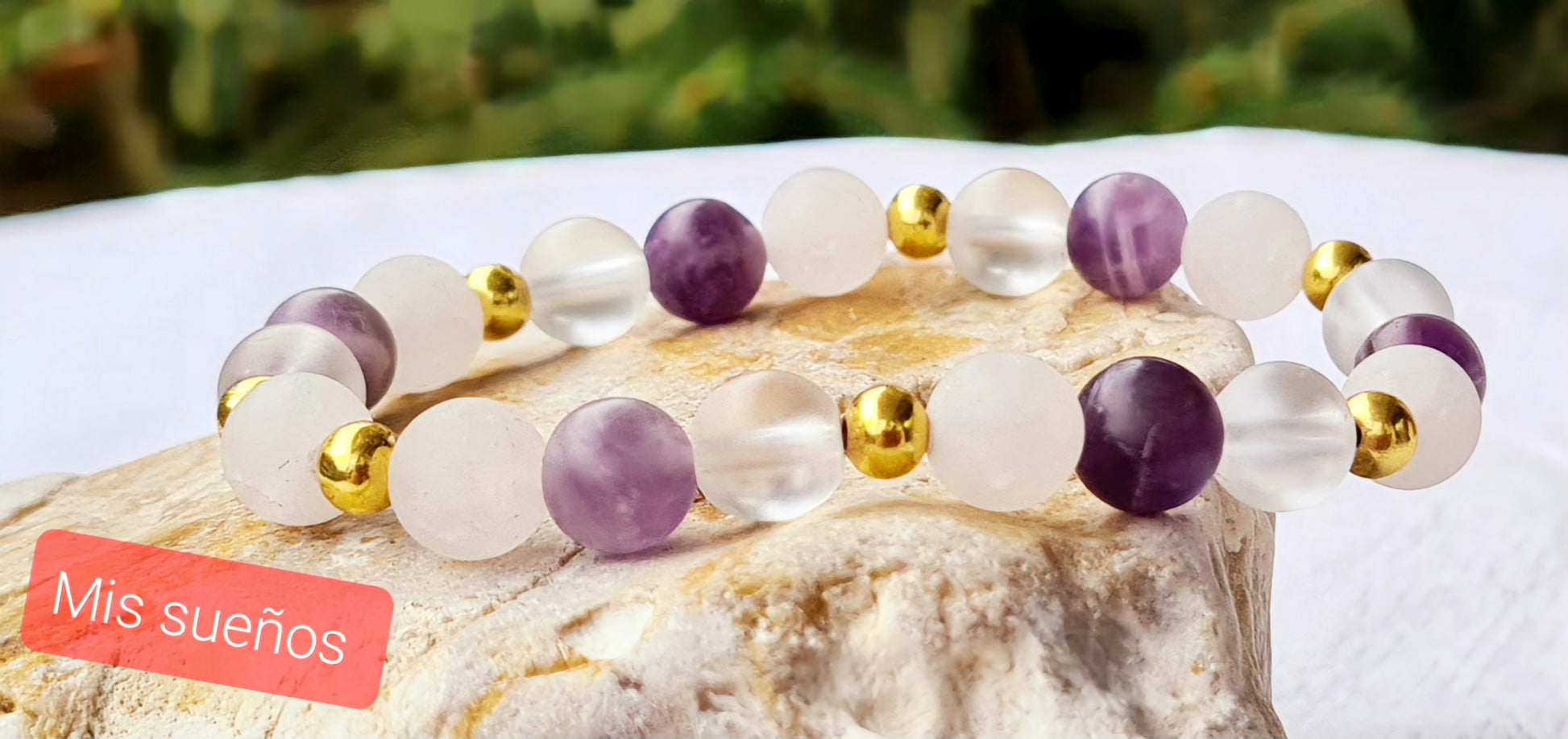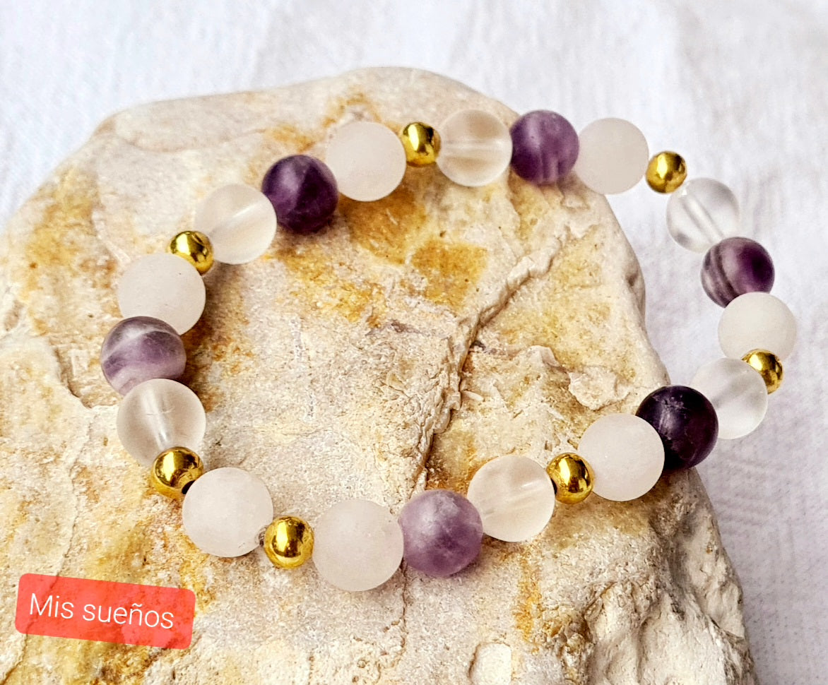 Das elegante Armband ist mit wunderschönen Amethyst, Bergkristall und Rosenquarz Naturstein-Perlen (8mm) besetzt, die von 14K auf Messing vergoldeten Perlen begleitet werden. Die Maße sind hier ca. 19cm, der Preis kann je nach Größenanfrage variieren. Hier wurden die Perlen auf Gummiband aufgefädelt, können aber auch auf Draht oder auch auf hochqualitative Perlseide aufgefädelt und mit einem hochwertiger Karabiner-Verschluss 925 Silber versehen werden.