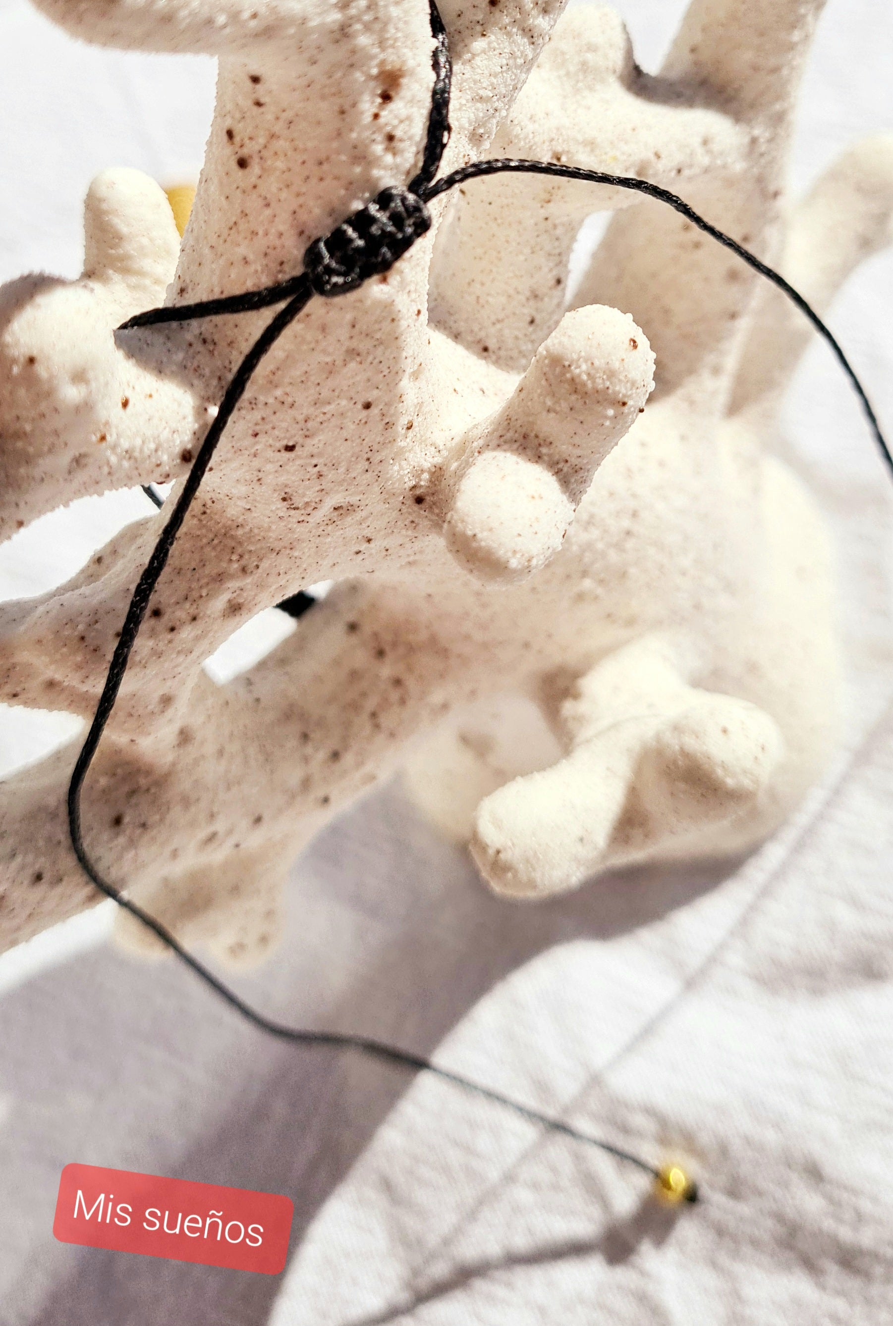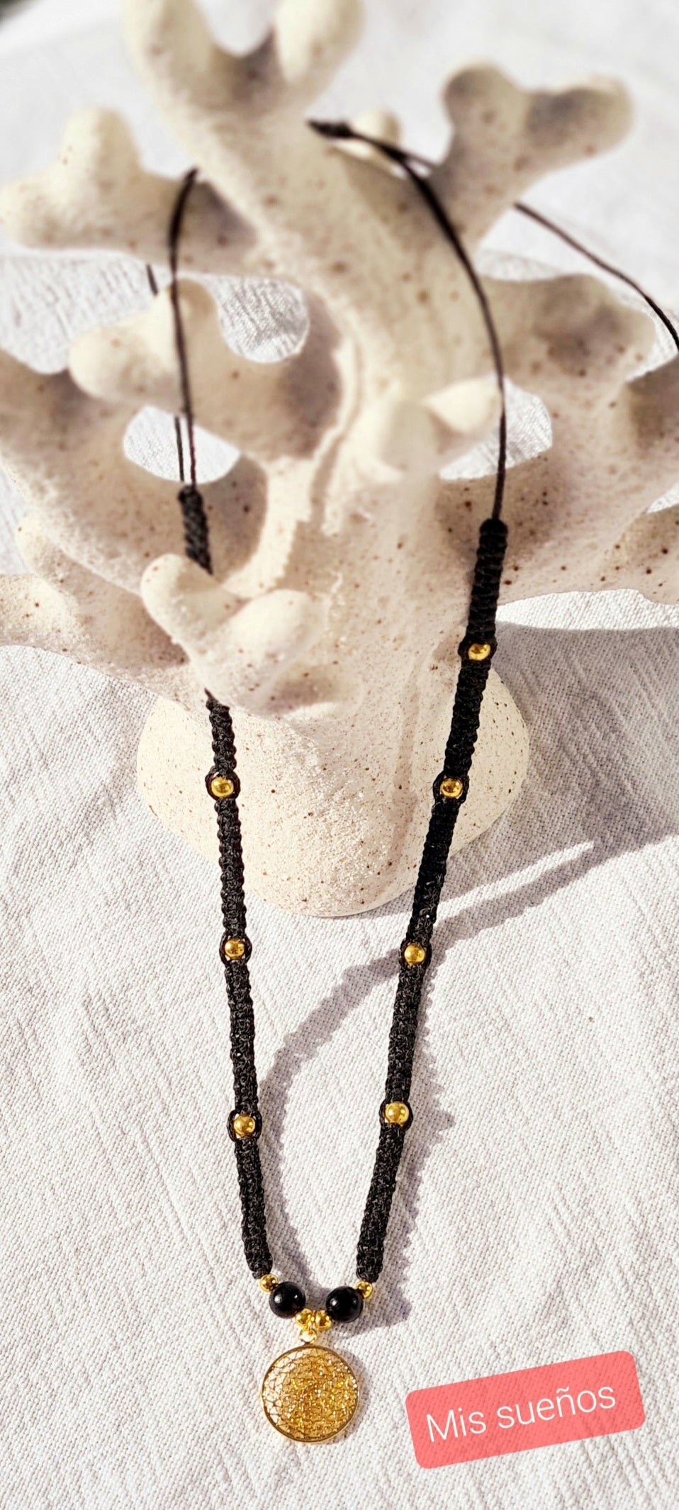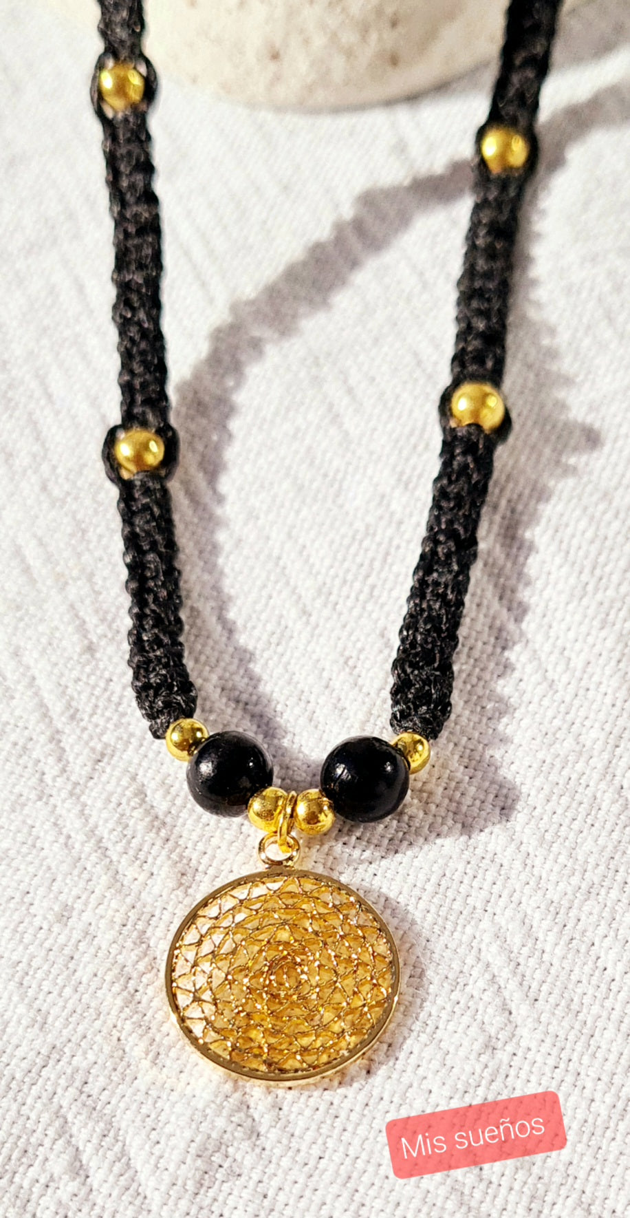 Diese lockere Halskette der Kollektion "Filly" ist mit einer lockeren Makramee-Struktur aus hochqualitativem Garn gefertigt. In die feine Handarbeit sind 14K auf Messing vergoldete Perlen eingearbeitet. Geziert wird das ganze mit einem filigranen runden Anhänger aus Metall (Zamak). Die Halskette ist ca. 47cm lang und mit Makramee-Zugverschluss versehen.