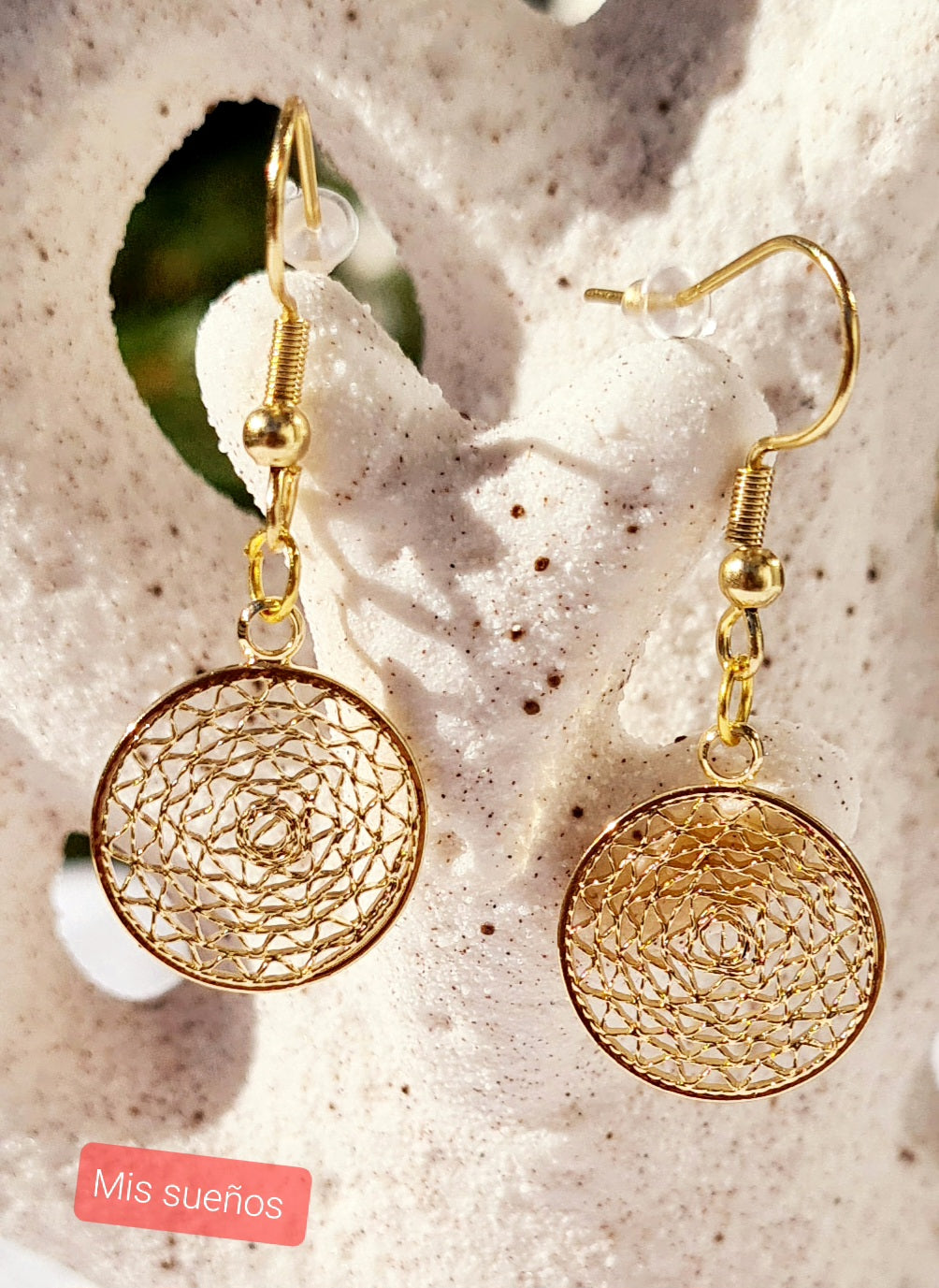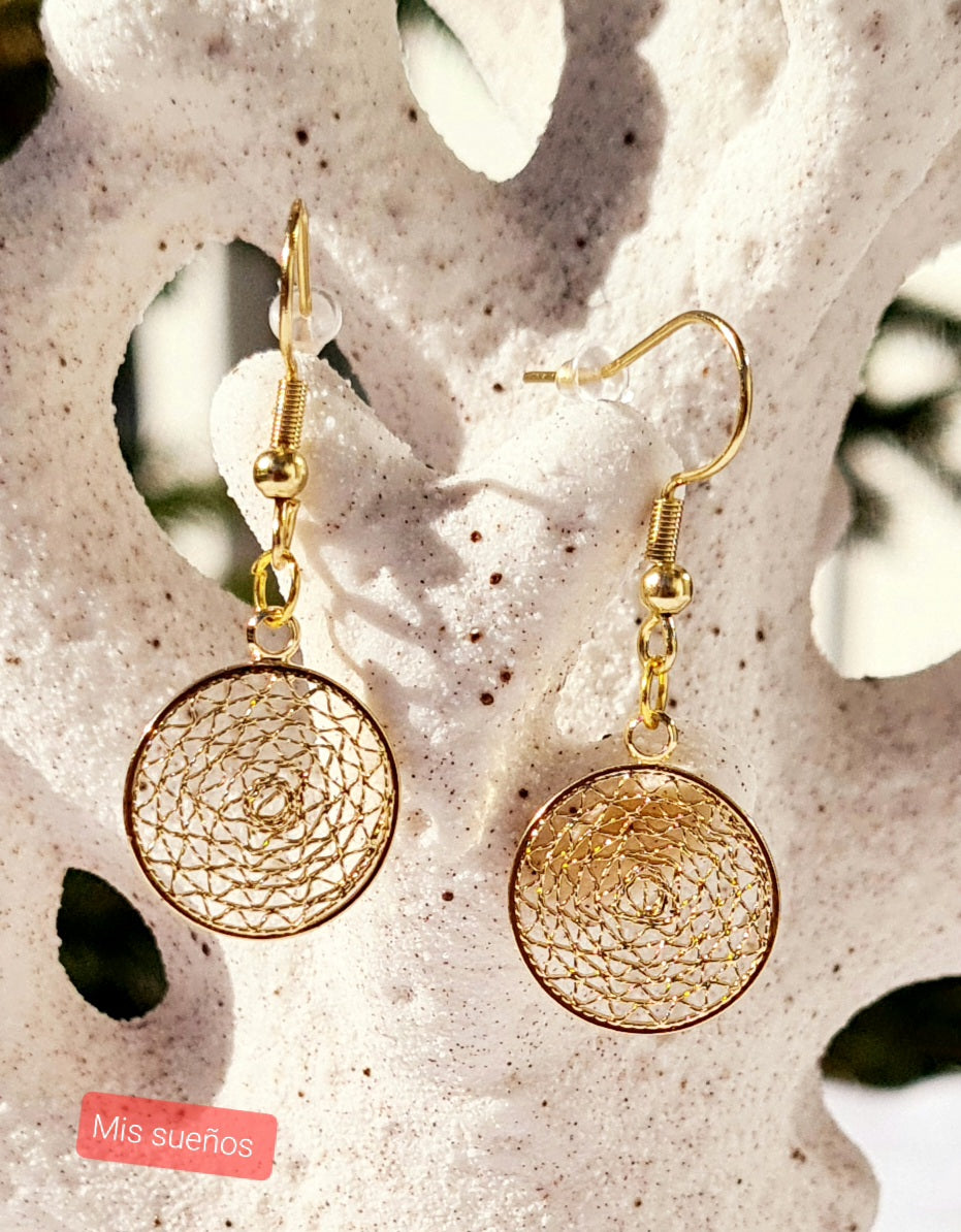 Dieses schöne paar Ohrringe der Kollektion "Filly" wird geziert mit filigranen runden Anhängern aus Metall (Zamak). Die Ohrhaken sind 24K auf 925 Silber vergoldet. Die Haken sind mit Gummipfropfen als Verrutschsicherung versehen.