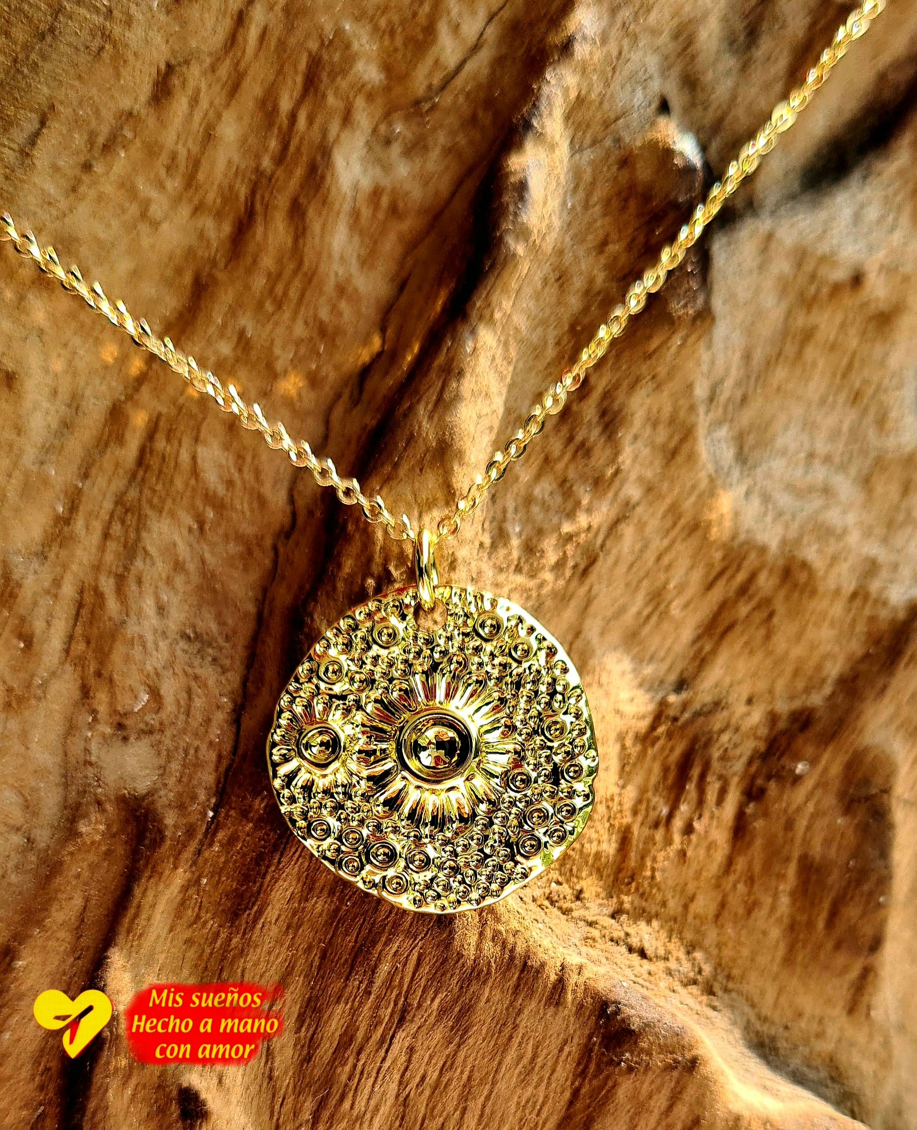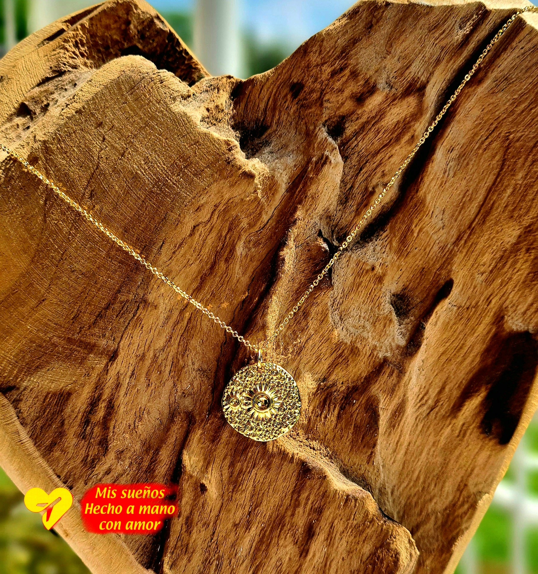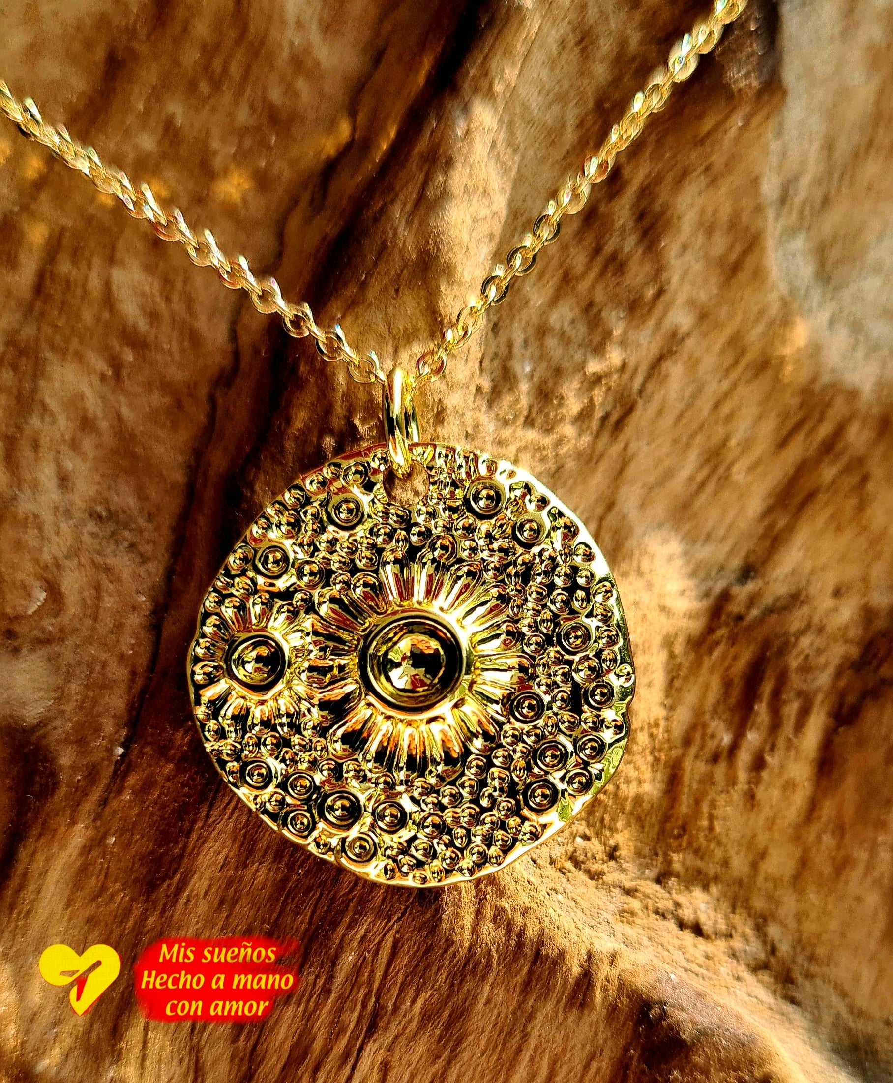 El Sol ist ein ganz toller Anhänger, an einer feinen goldenen Kette. Die Kette ist 50cm lang und in der Länge verstellbar. Sie besteht aus 925 Silber und ist 18 Karat vergoldet. Der Anhänger besteht aus Messing und ist 18 Karat vergoldet.