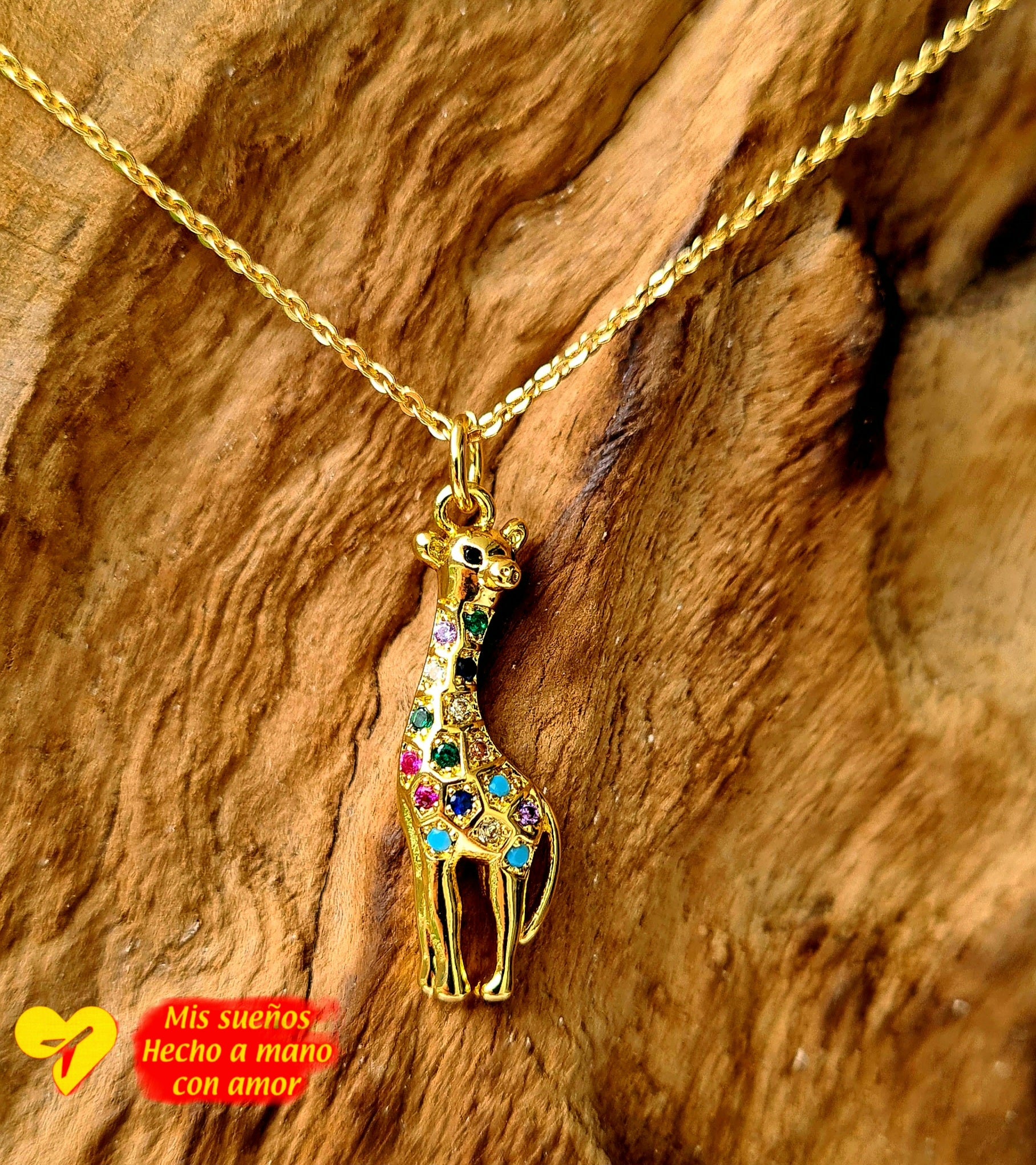 Ein wunderschöner Giraffe Anhänger, an einer feinen goldenen Kette. Die Kette ist 50cm lang und in der Länge verstellbar. Sie besteht aus 925 Silber und ist 18 Karat vergoldet. Der Anhänger besteht aus Messing und ist 18 Karat vergoldet. Er wird von bunten Zirkonia Steinchen geziert.