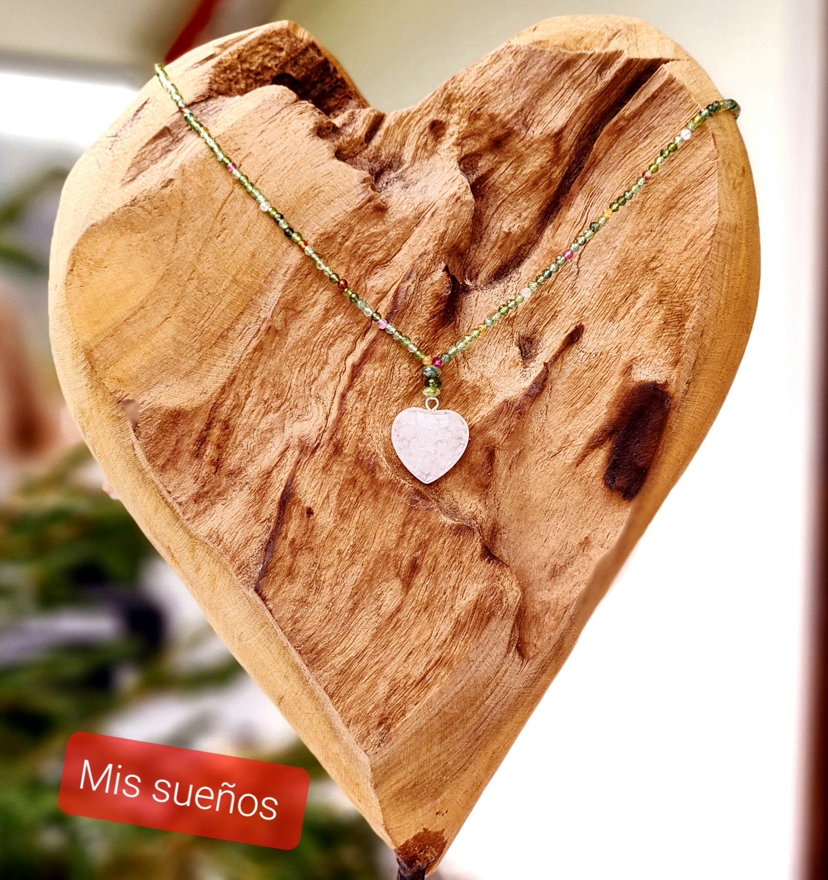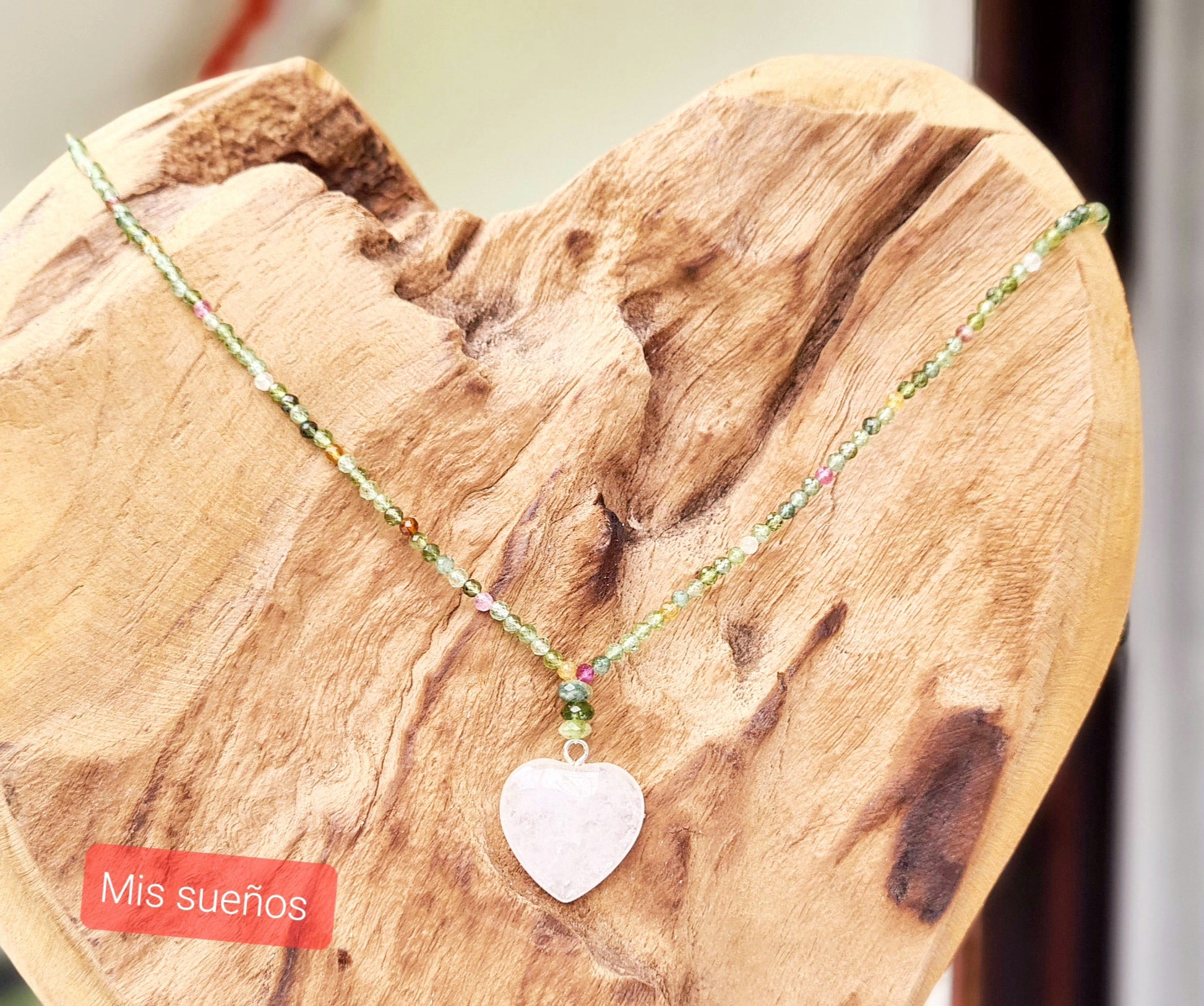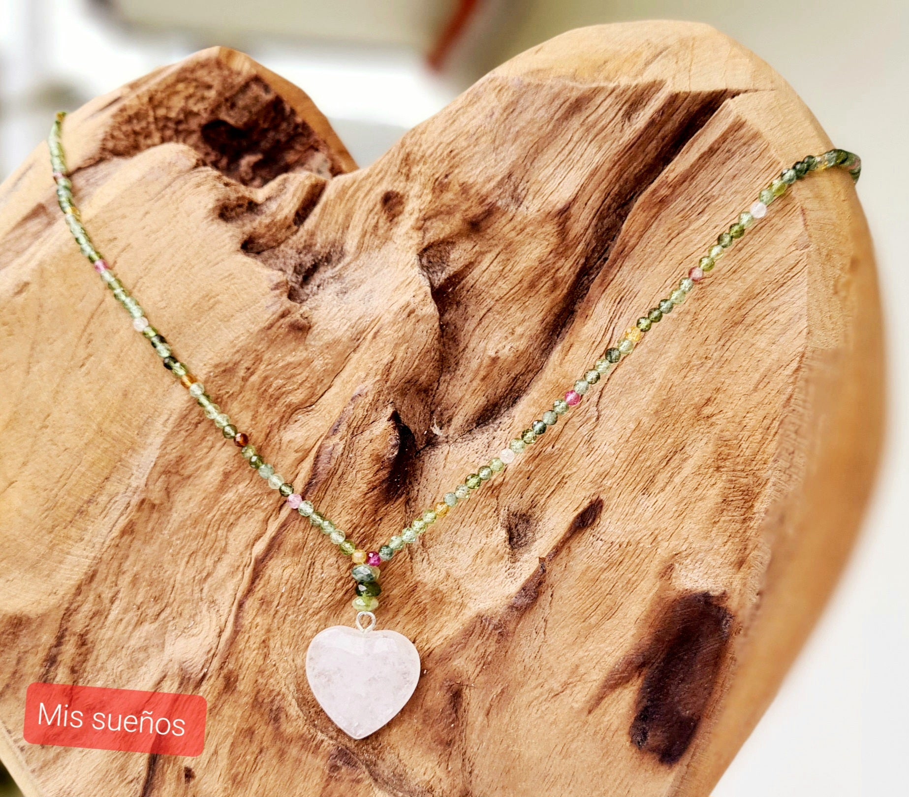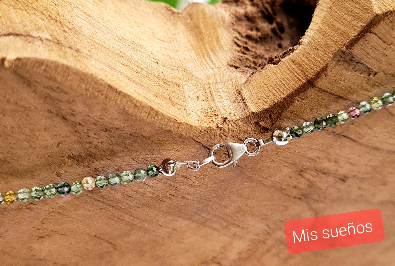 Die elegante Halskette ist überwiegend mit facettierten funkelnd grünen Turmalin Edelstein-Perlen (3mm) besetzt und werden von facettierten bunten Turmalin Edelstein-Perlen (2,5mm) begleitet. Abgerundet wird diese wunderschöne Halskette, von einem Herz aus Bergkristall. Die Maße sind hier ca. 46-50cm, der Preis kann je nach Größenanfrage variieren. Die Perlen sind auf hochqualitative Perlseide aufgefädelt. Es ist ein hochwertiger Karabiner-Verschluss 925 Silber angebracht.
