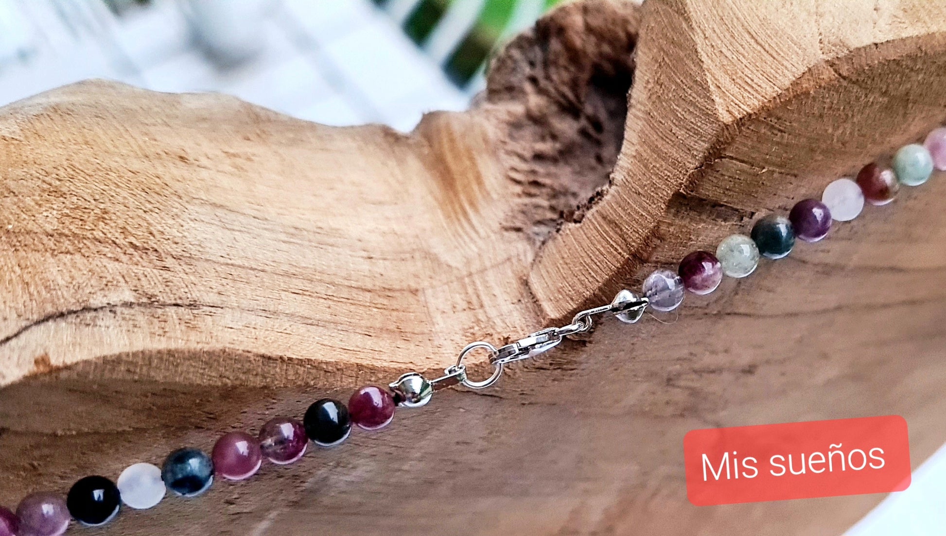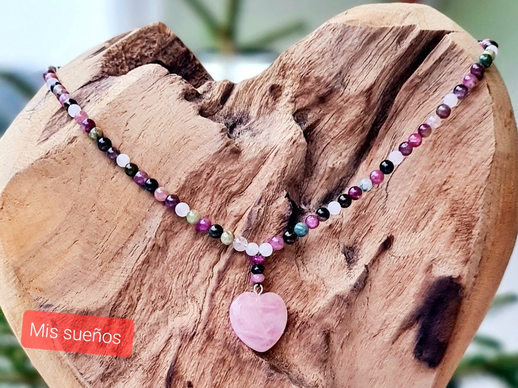 Die elegante Halskette ist überwiegend mit runden bunten Turmalin Edelstein-Perlen (4-5mm) besetzt und werden von matten Rosenquarz Edelstein-Perlen (4mm) begleitet. Abgerundet wird diese wunderschöne Halskette, von einem Herz aus Rosenquarz. Die Maße sind hier ca. 46-50cm, der Preis kann je nach Größenanfrage variieren. Die Perlen sind auf hochqualitative Perlseide aufgefädelt. Es ist ein hochwertiger Karabiner-Verschluss 925 Silber angebracht.