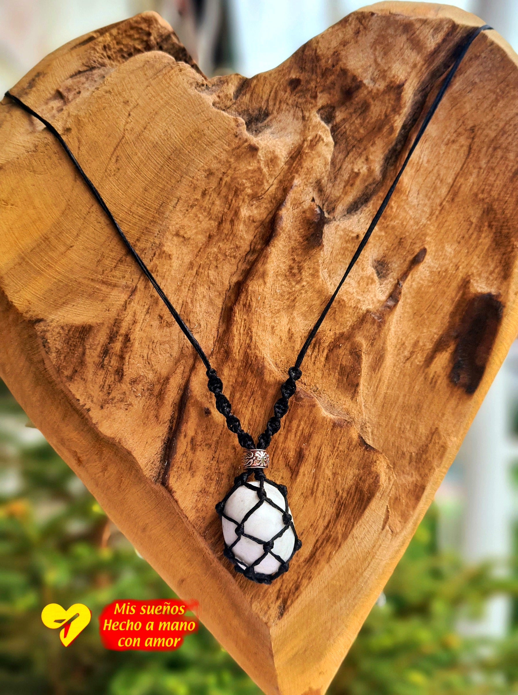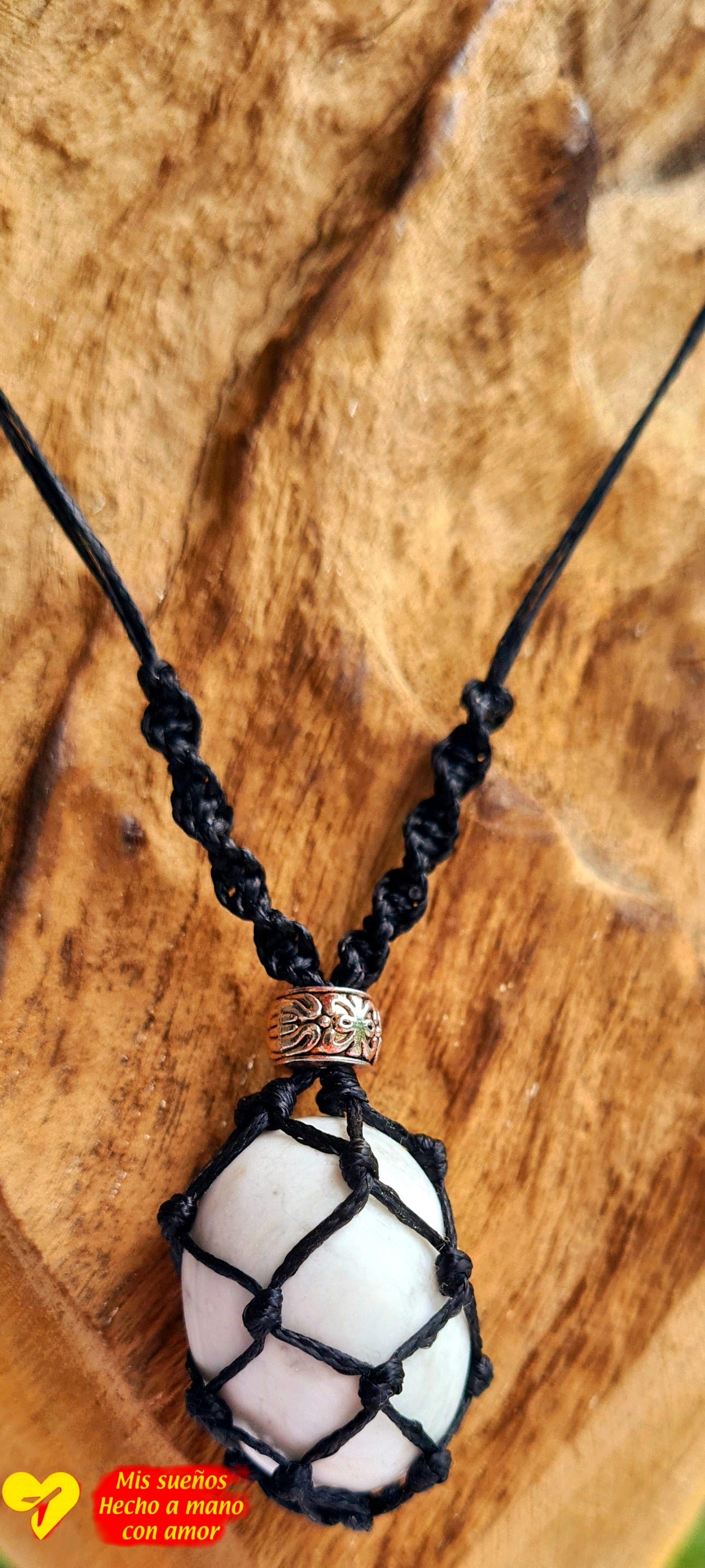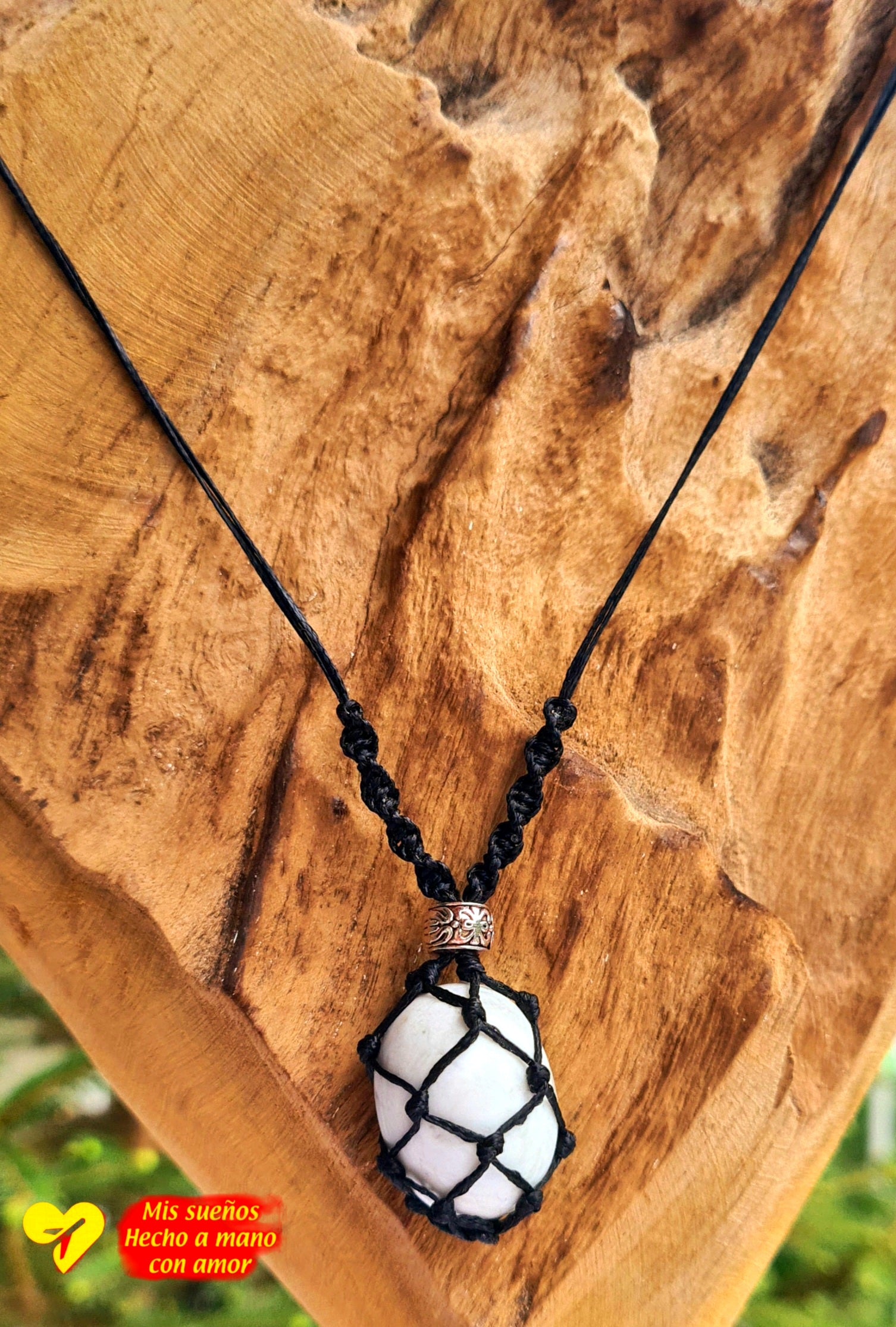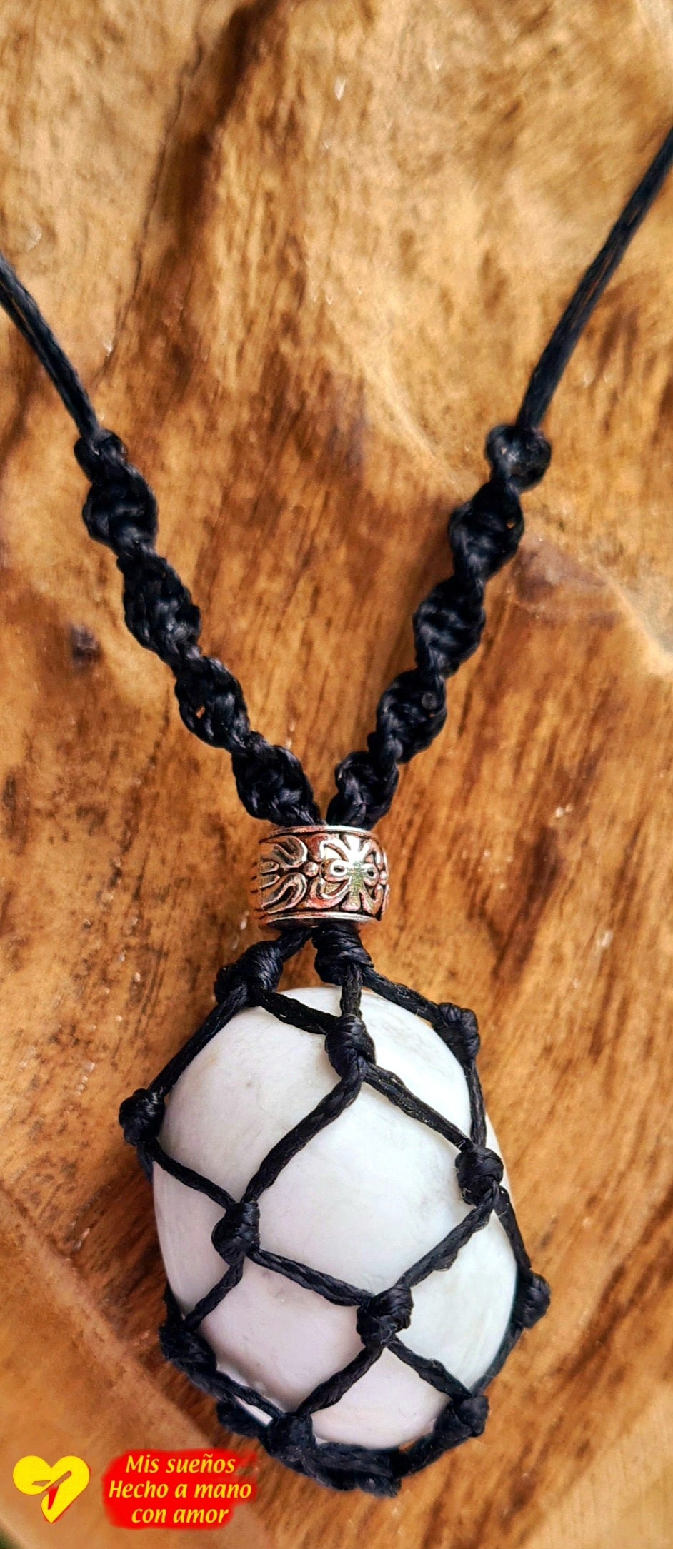 Diese wunderschöne Halskette ist im lockeren Makramee-Stil aus hochqualitativem Garn gefertigt. In die feine Handarbeit ist ein Magnesit Trommelstein eingearbeitet. Die Halskette ist ca. 40cm lang und ist mit einem Makramee-Zugverschluss versehen. Verschiedene Varianten sind möglich, einfach vor der Bestellung eine Mail an mich senden und ich gehe gerne auf deine Wünsche ein.