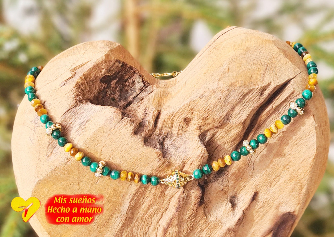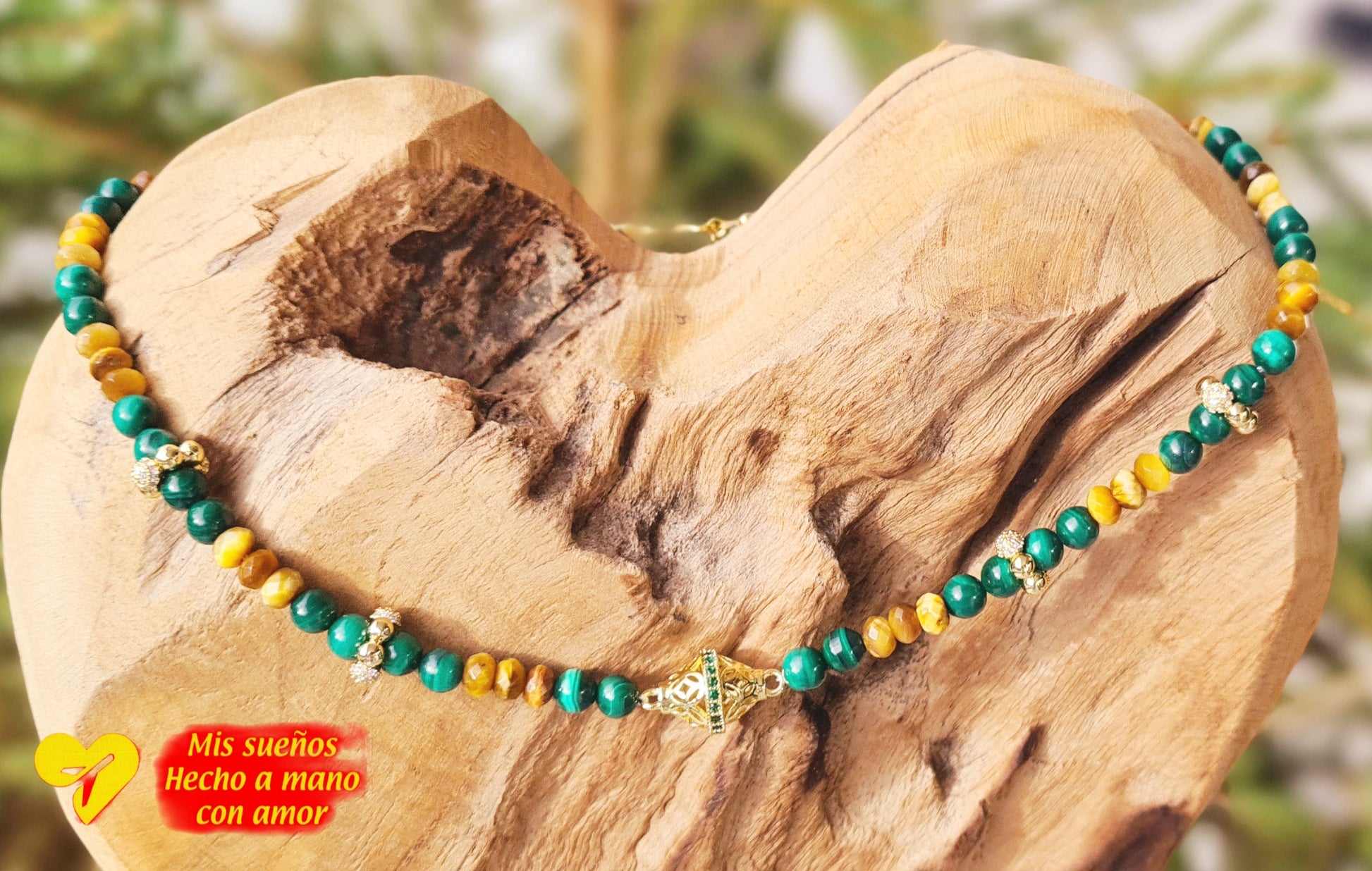 Ein absolut edles Schmuckstück! Hier finden sich wunderschöne runde, glatte Malachit-Natursteinperlen (6mm) und glänzend facetierte Tigeraugen-Natursteinperlen (3x5mm). Sie sind zusammen mit edlen Trennscheiben (18K vergoldet) mit kleinen Zirkonia Steinchen, auf hochqualitative Perlseite aufgefädelt. Diese tollen Schmuckstücke, sind mit einem edlen, filigranen Verbinder (18K vergoldet) mit dazu passenden grünen Zirkonia Steinchen verbunden. Es ist ein Karabiner-Verschluss 925 Silber 18K vergoldet mit dazu gehöriger Verlängerungskette angebracht. Dieses edle Schmuckstück, wird dich glänzen lassen und die Blicke auf dich ziehen.