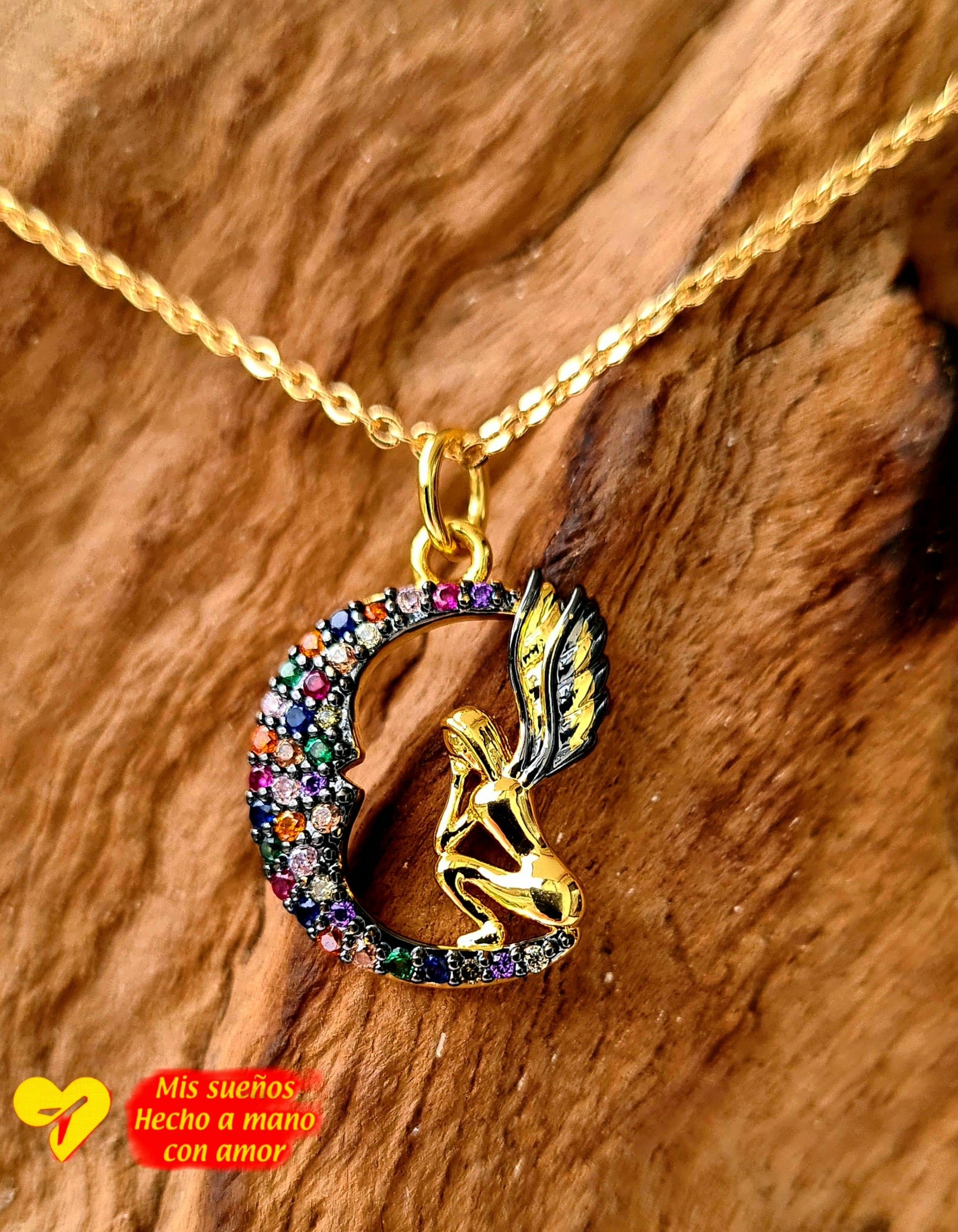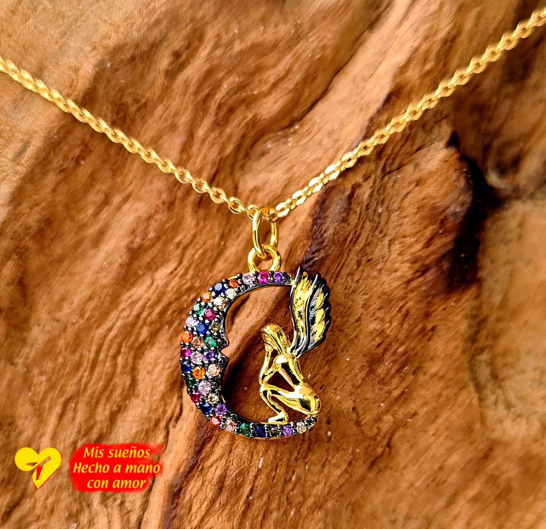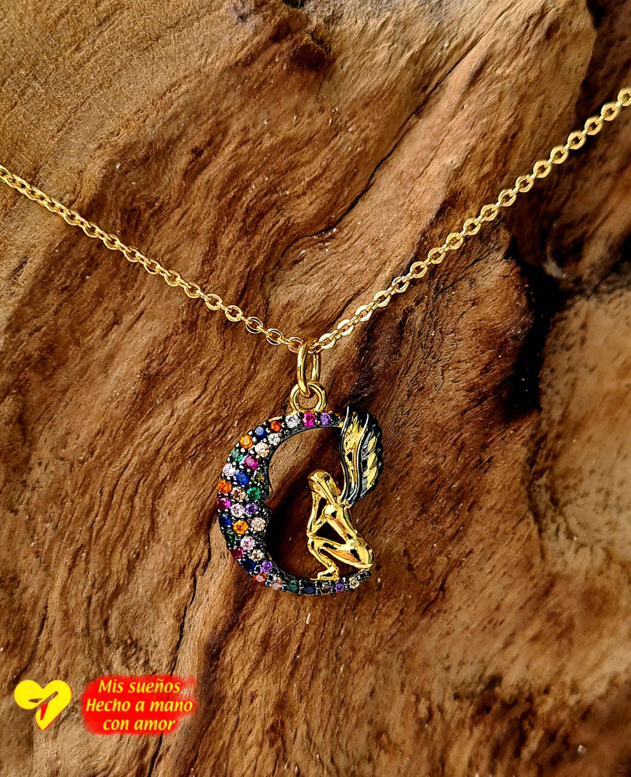 Ein wunderschöner Mond mit Elfe Anhänger, an einer feinen goldenen Kette. Die Kette ist 50cm lang und in der Länge verstellbar. Sie besteht aus 925 Silber und ist 18 Karat vergoldet. Der Anhänger besteht aus Messing und ist 18 Karat vergoldet. Er wird von bunten Zirkonia Steinchen geziert.