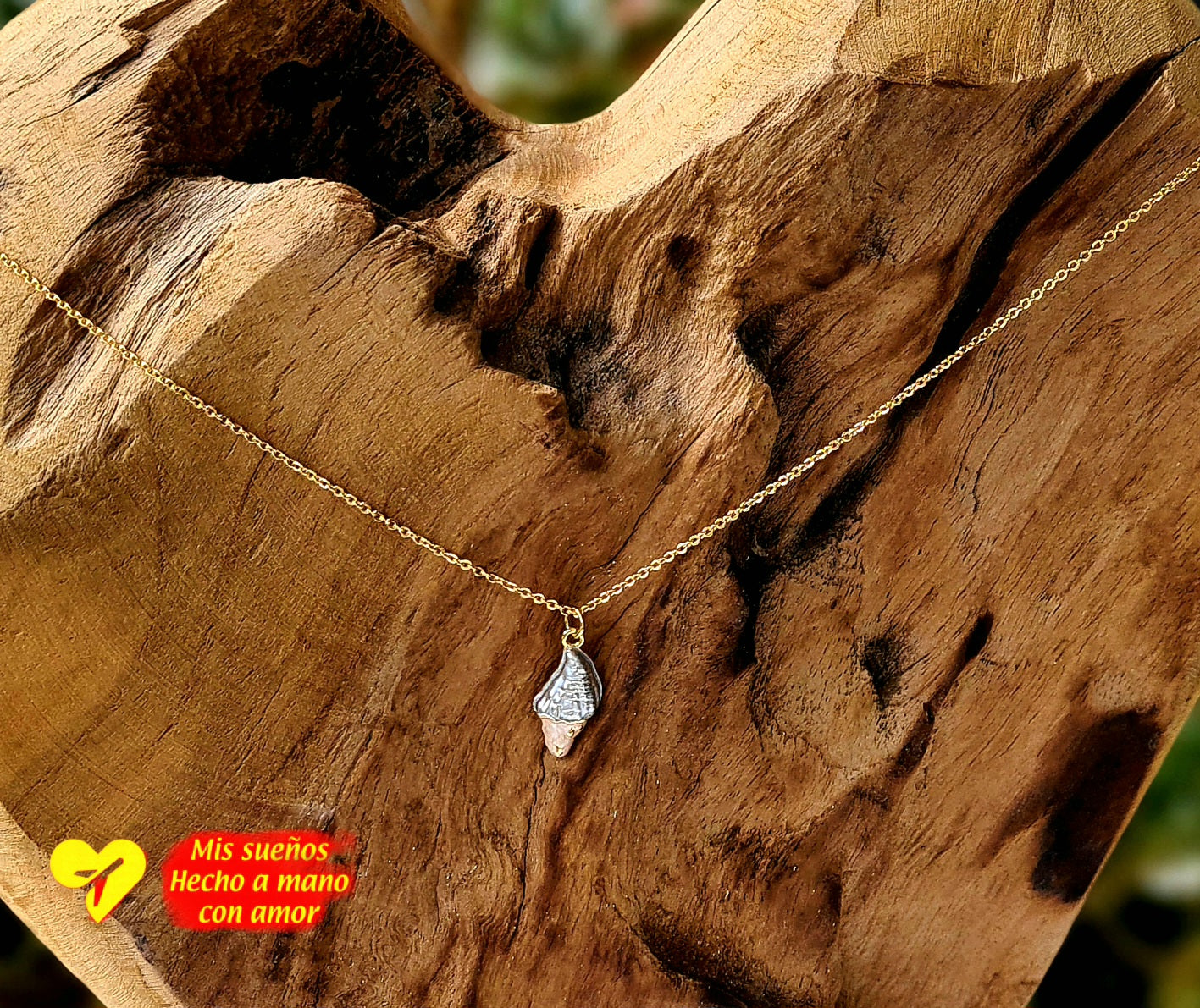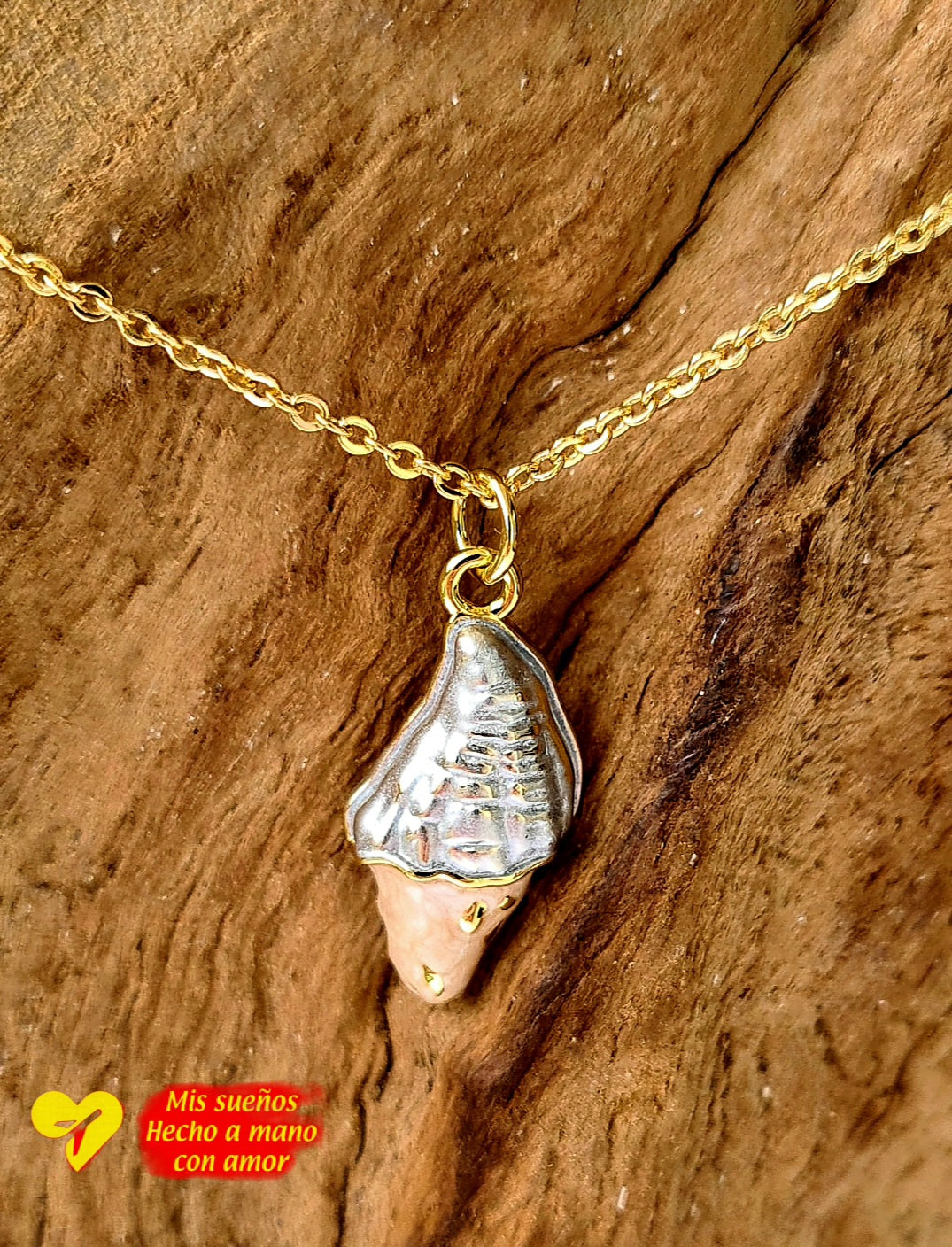 Ein wunderschöner Muschel-Anhänger, an einer feinen goldenen Kette. Die Kette ist 50cm lang und in der Länge verstellbar. Sie besteht aus 925 Silber und ist 18 Karat vergoldet. Der Anhänger besteht aus Emaille und Messing und ist ebenfalls 18 Karat vergoldet.