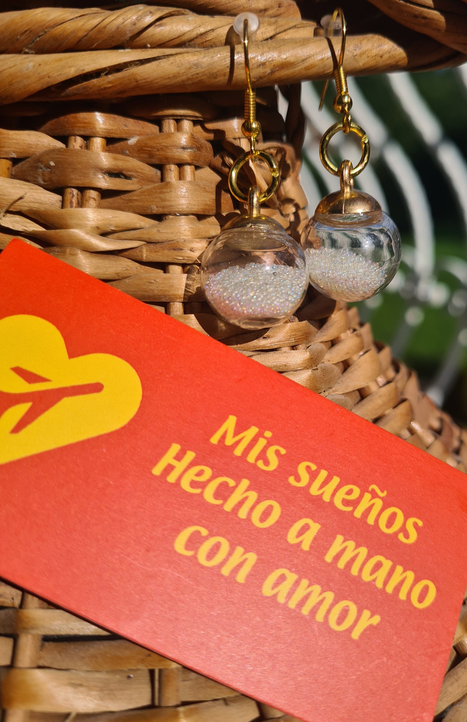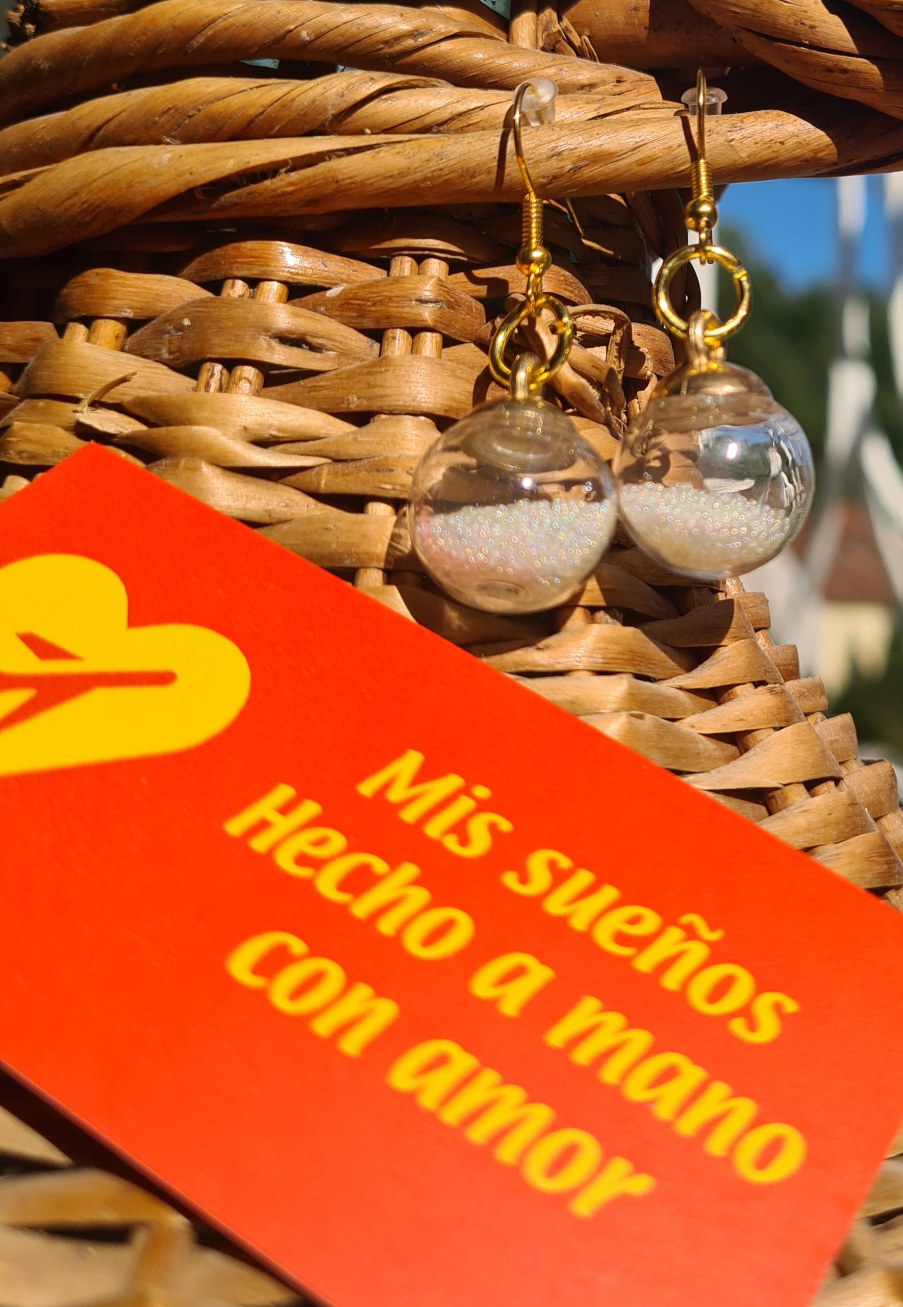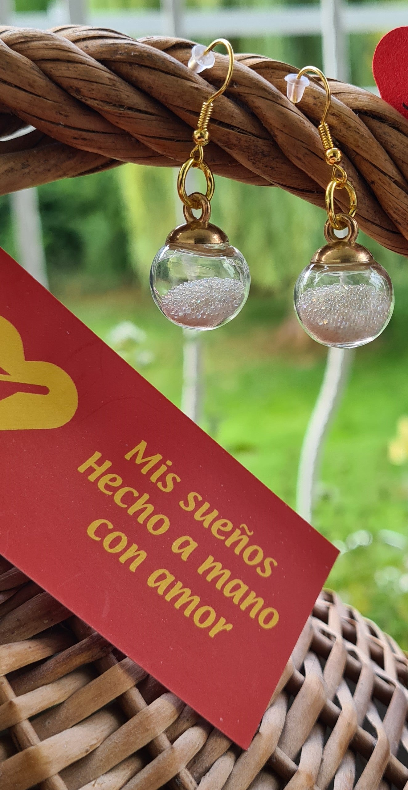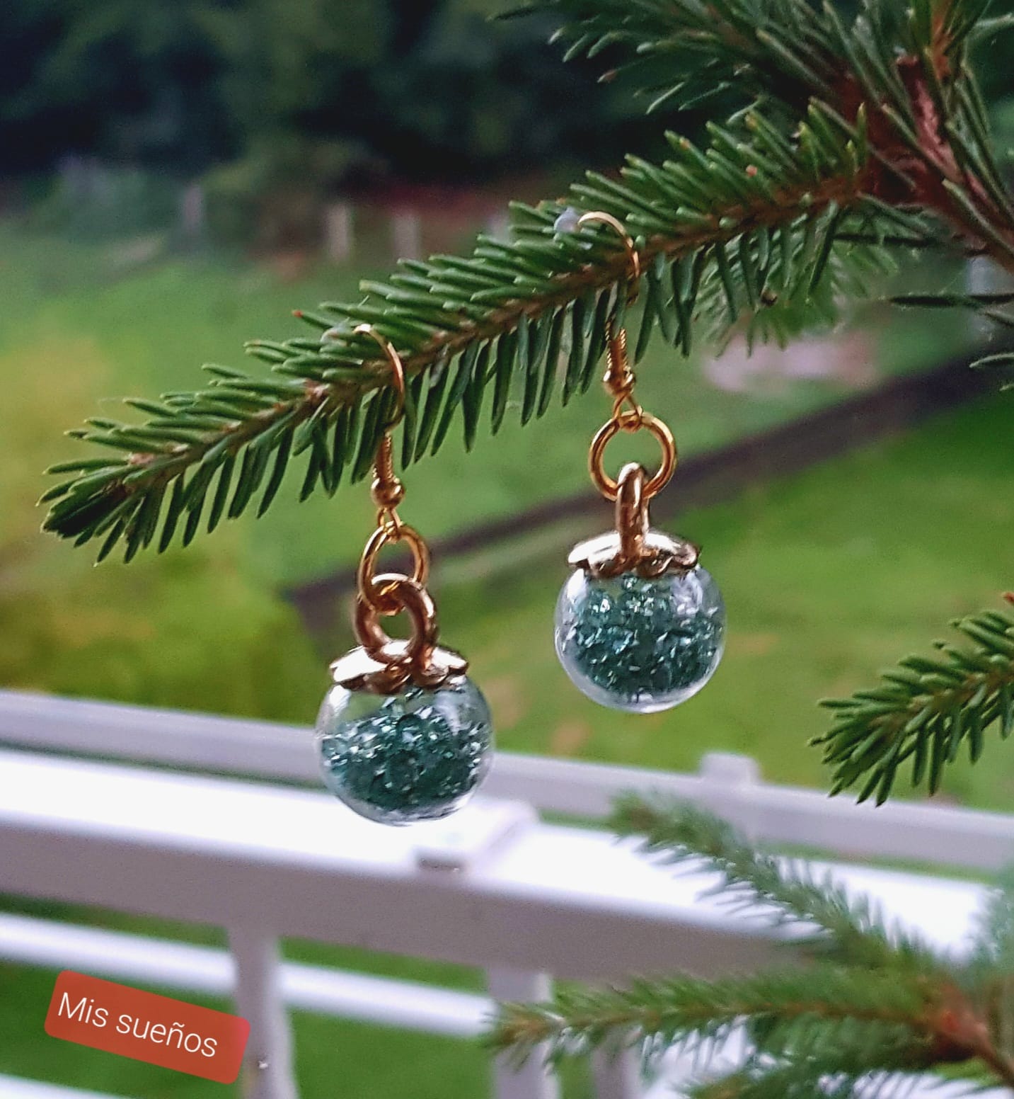 Ein schönes paar Ohrringe, das an Schneekugeln erinnert. In gold mit weißem oder grünen Granulat in Glaskügelchen. Die Haken sind aus 925er Silber und sind mit Gummipfropfen als Verrutschsicherung versehen.