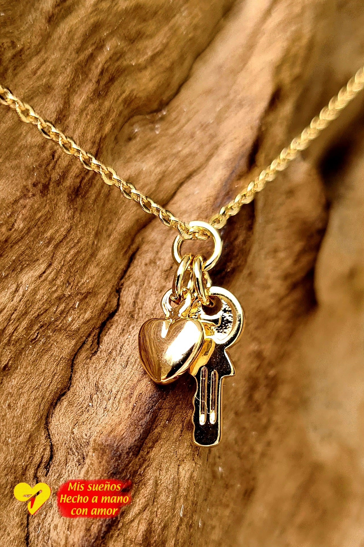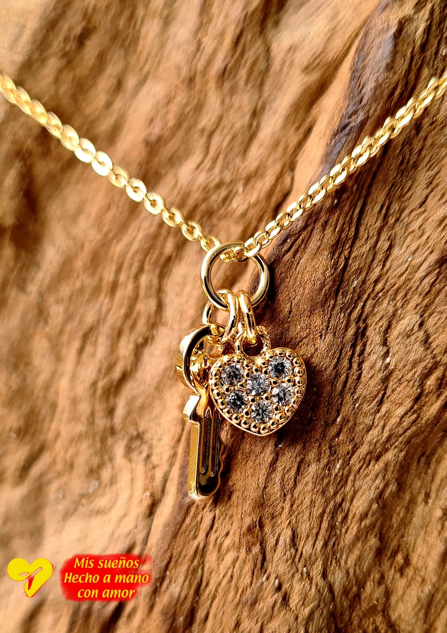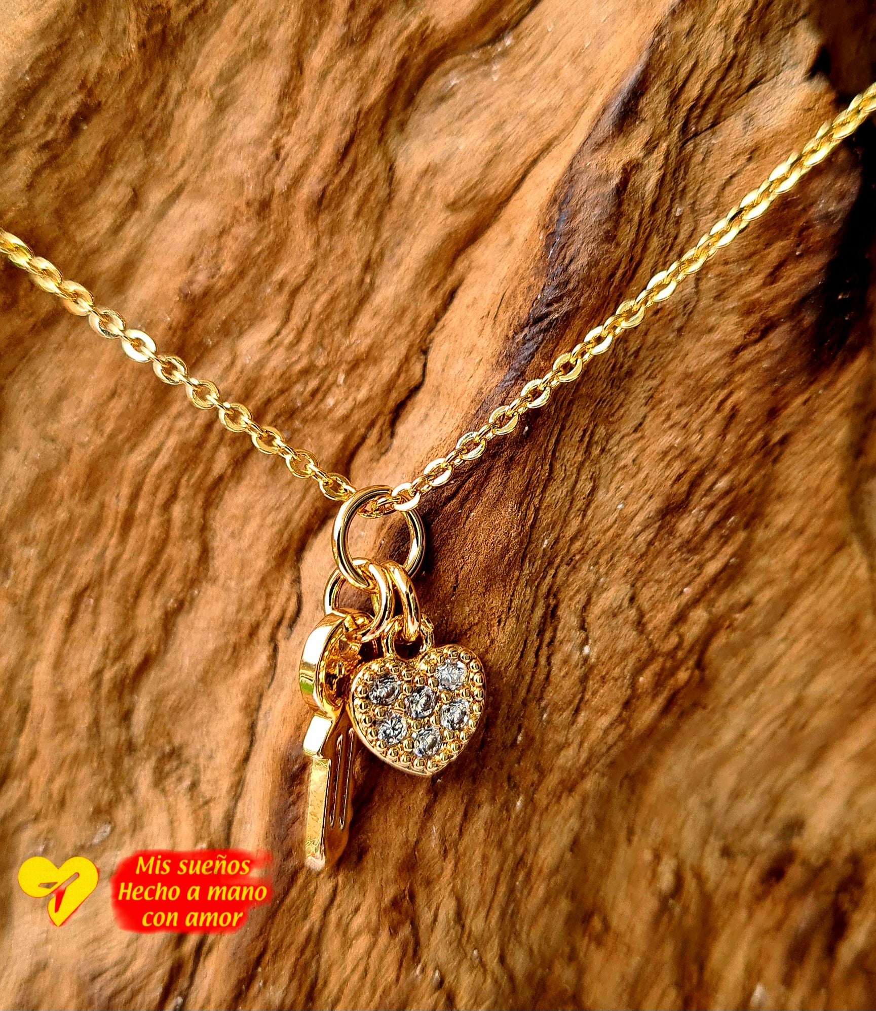 Wunderschöne Schlüssel mit Herz Anhänger, an einer feinen goldenen Kette. Die Kette ist 50cm lang und in der Länge verstellbar. Sie besteht aus 925 Silber und ist 18 Karat vergoldet. Die Anhänger bestehen aus Messing und sind 18 Karat vergoldet. Der Eine wird von kleinen Zirkonia Steinchen geziert.