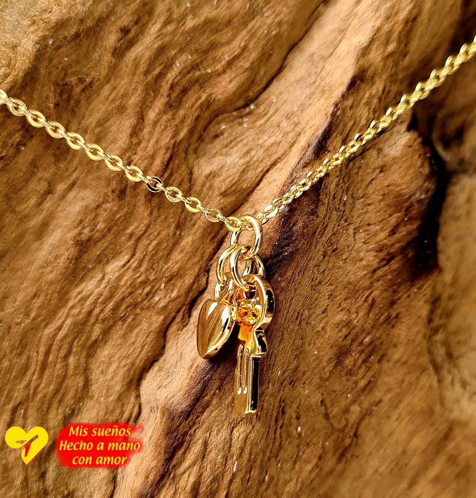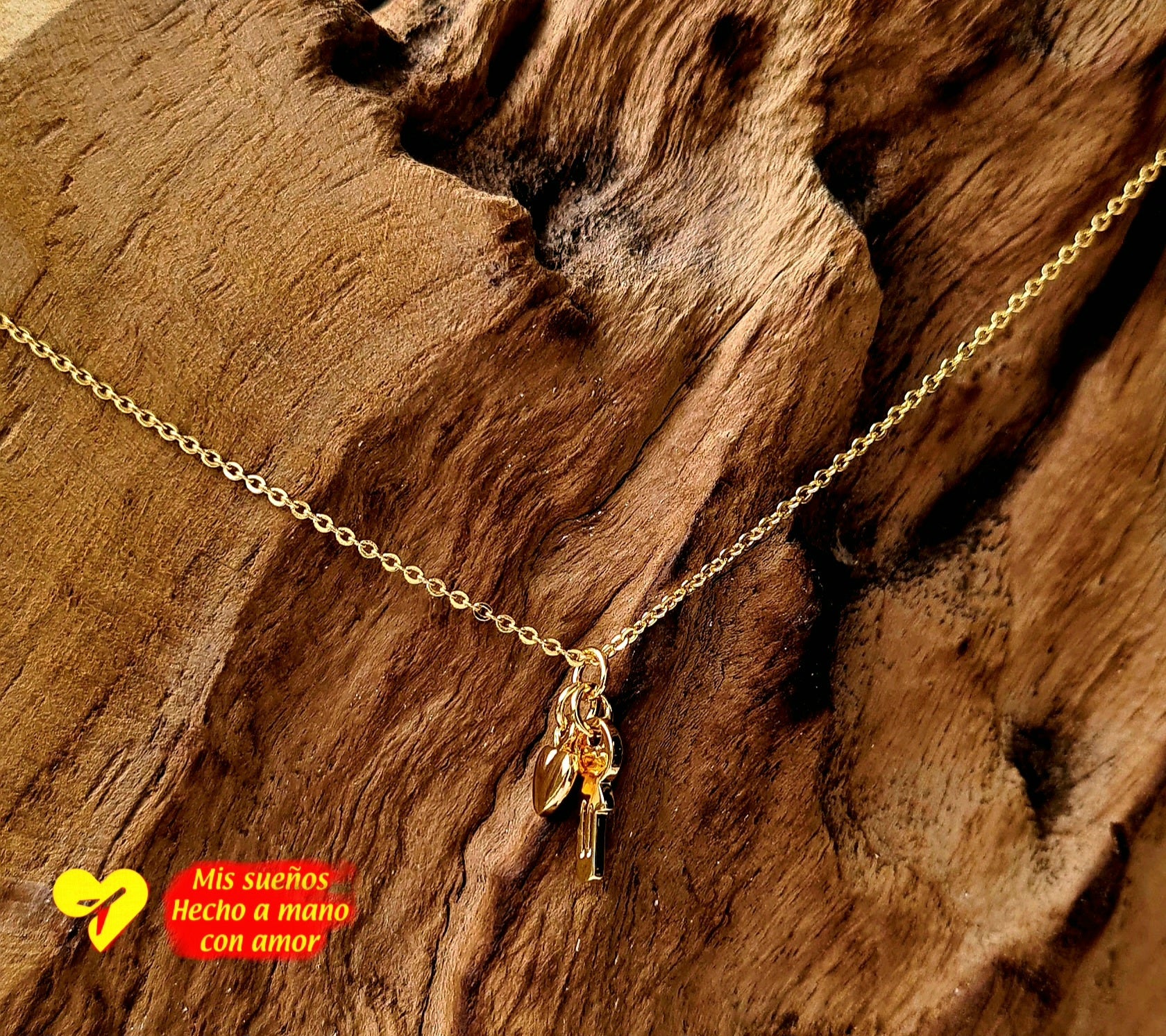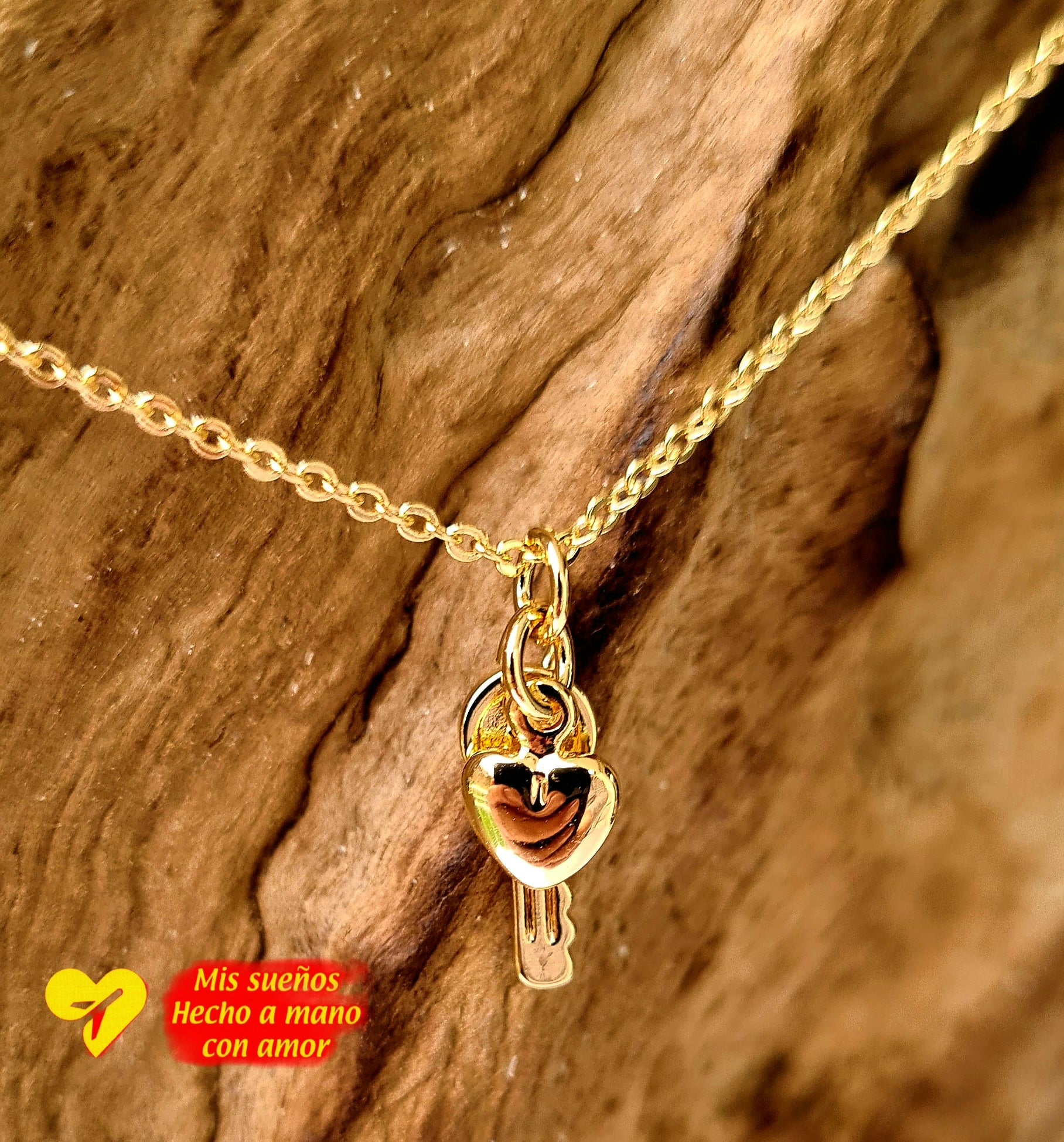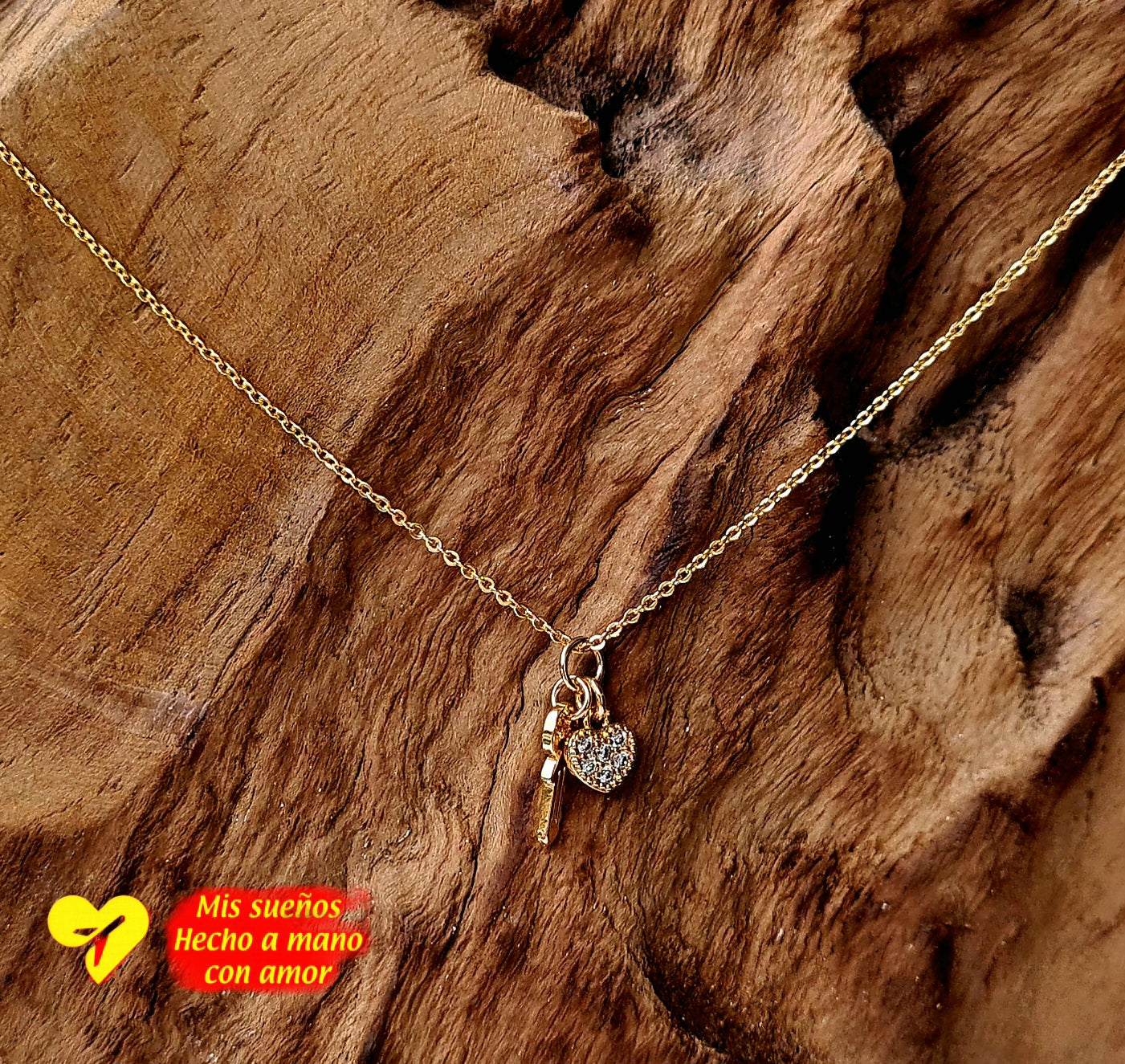 Wunderschöne Schlüssel mit Herz Anhänger, an einer feinen goldenen Kette. Die Kette ist 50cm lang und in der Länge verstellbar. Sie besteht aus 925 Silber und ist 18 Karat vergoldet. Die Anhänger bestehen aus Messing und sind 18 Karat vergoldet. Der Eine wird von kleinen Zirkonia Steinchen geziert.