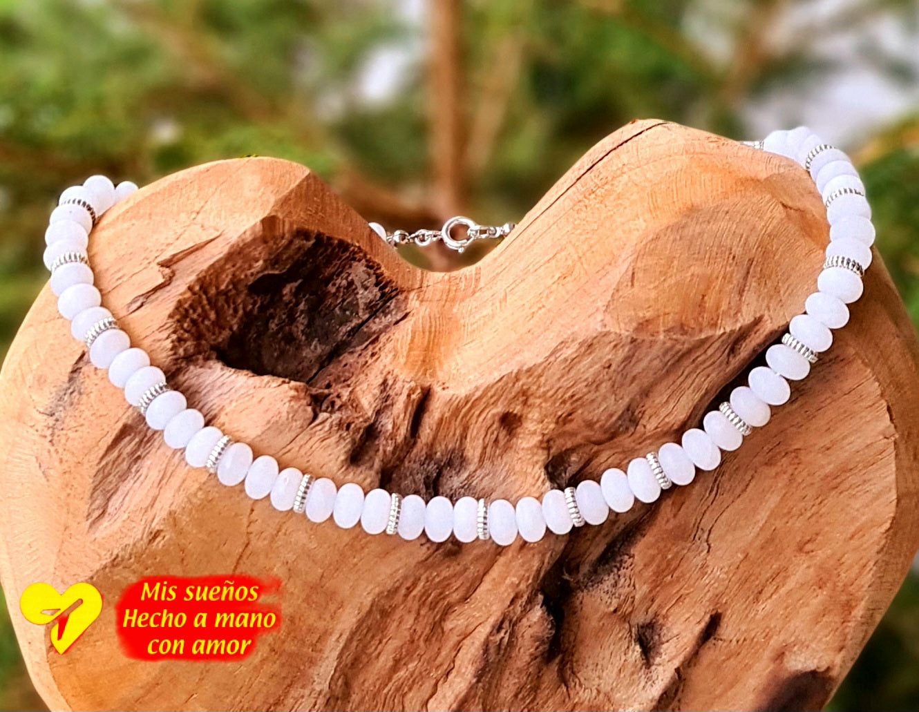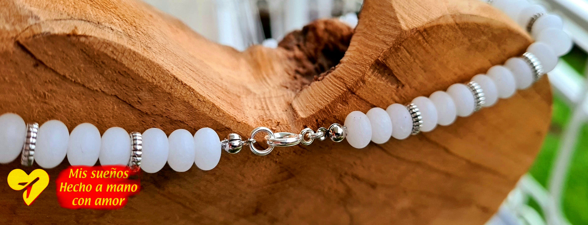 Diese elegante Rundhalskette ist mit wunderschönen matten Naturstein-Perlen aus Schneequarz auch Milchquarz genannt (5x8mm) besetzt. Geziert wird diese schicke Kette von silbernen Spacern aus Metall (Zamak). Die Maße sind hier ca. 42cm, der Preis kann je nach Größenanfrage variieren. Die Perlen sind auf hochwertige Perlseide aufgefädelt und mit einem hochwertiger Karabiner-Verschluss 925 Silber versehen.