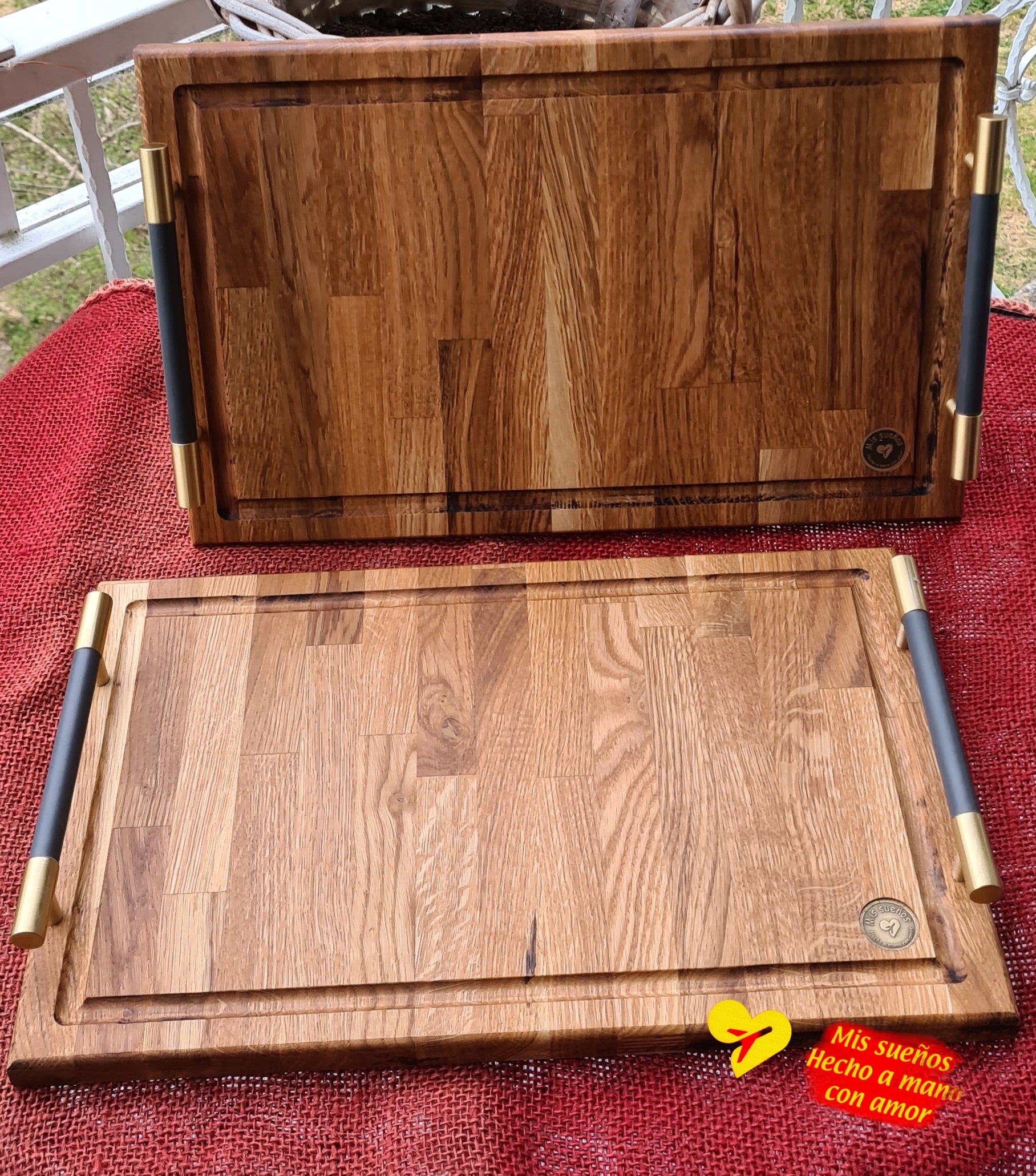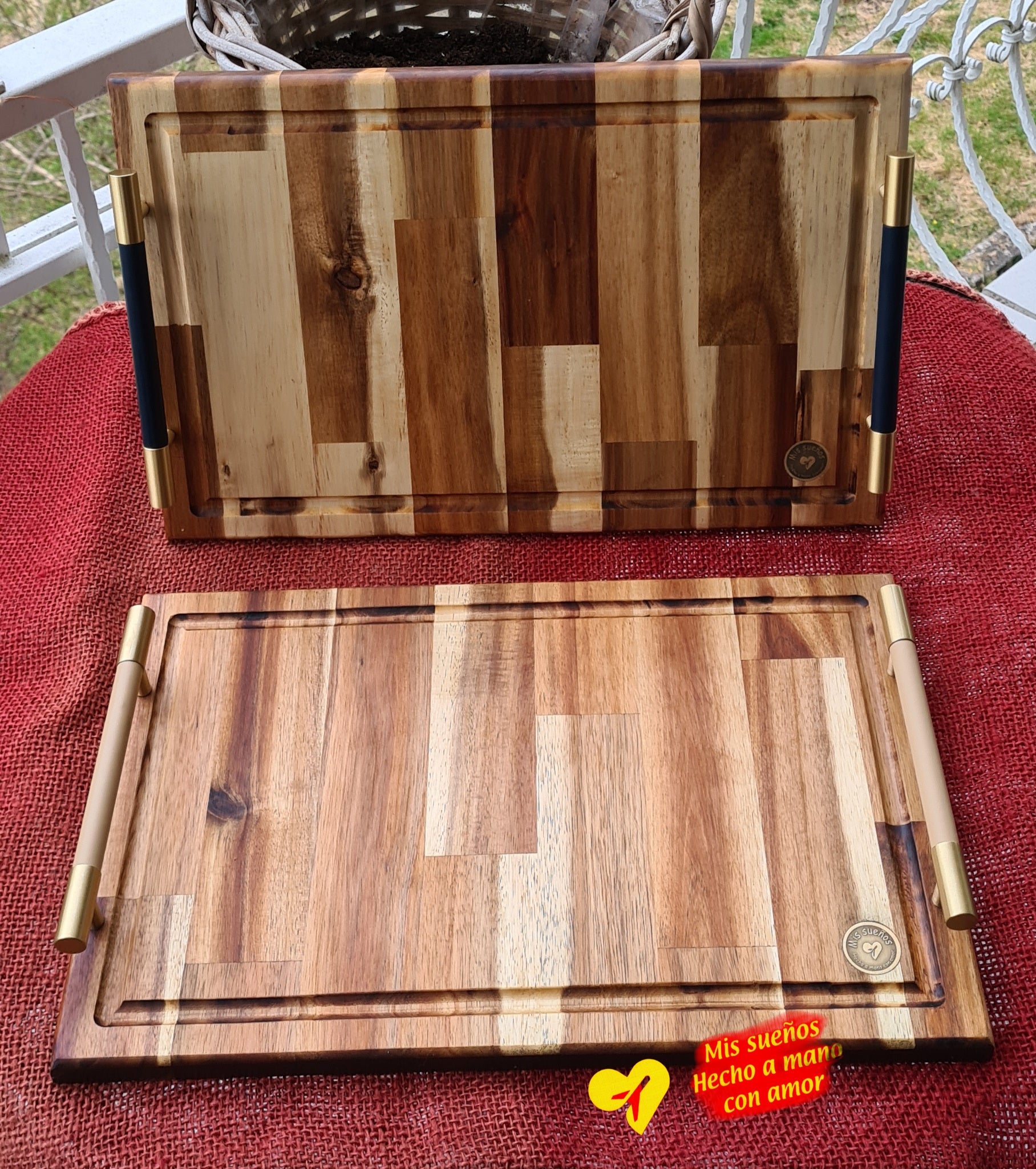Ein hochwertiges Servierbrett aus robustem Holz. Es hat die Maße von ca. 400mm x 260mm und ist 18mm dick. Es eignet sich hervorragend zum Anrichten von beispielsweise Fleisch, Fisch und Gemüse. Natürlich kann darauf auch geschnitten oder frische Kräuter gehackt werden. Die Saftrille verhindert das Weglaufen von Flüssigkeiten. Seitlich erleichtern hochwertige Griffe aus Messing und Ledereinbände in den Farben blau, beige oder grün die Handhabung und das Tragen des Servierbrettes.