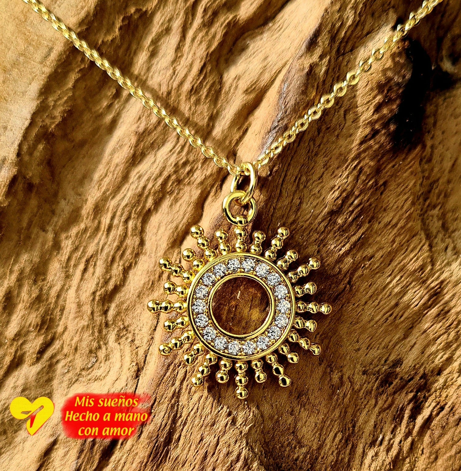 Ein wunderschöner Sonnen-Anhänger, an einer feinen goldenen Kette. Die Kette ist 50cm lang und in der Länge verstellbar. Sie besteht aus 925 Silber und ist 18 Karat vergoldet. Der Anhänger besteht aus Messing und ist ebenfalls 18 Karat vergoldet, er wird von kleinen Zirkonia Steinchen geziert.