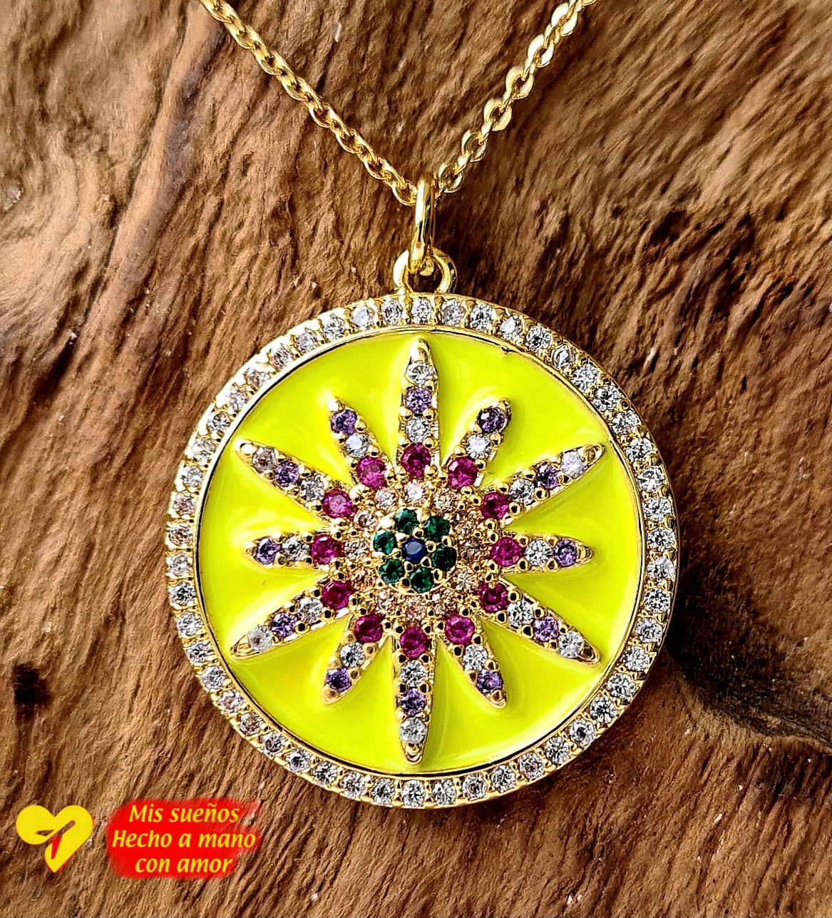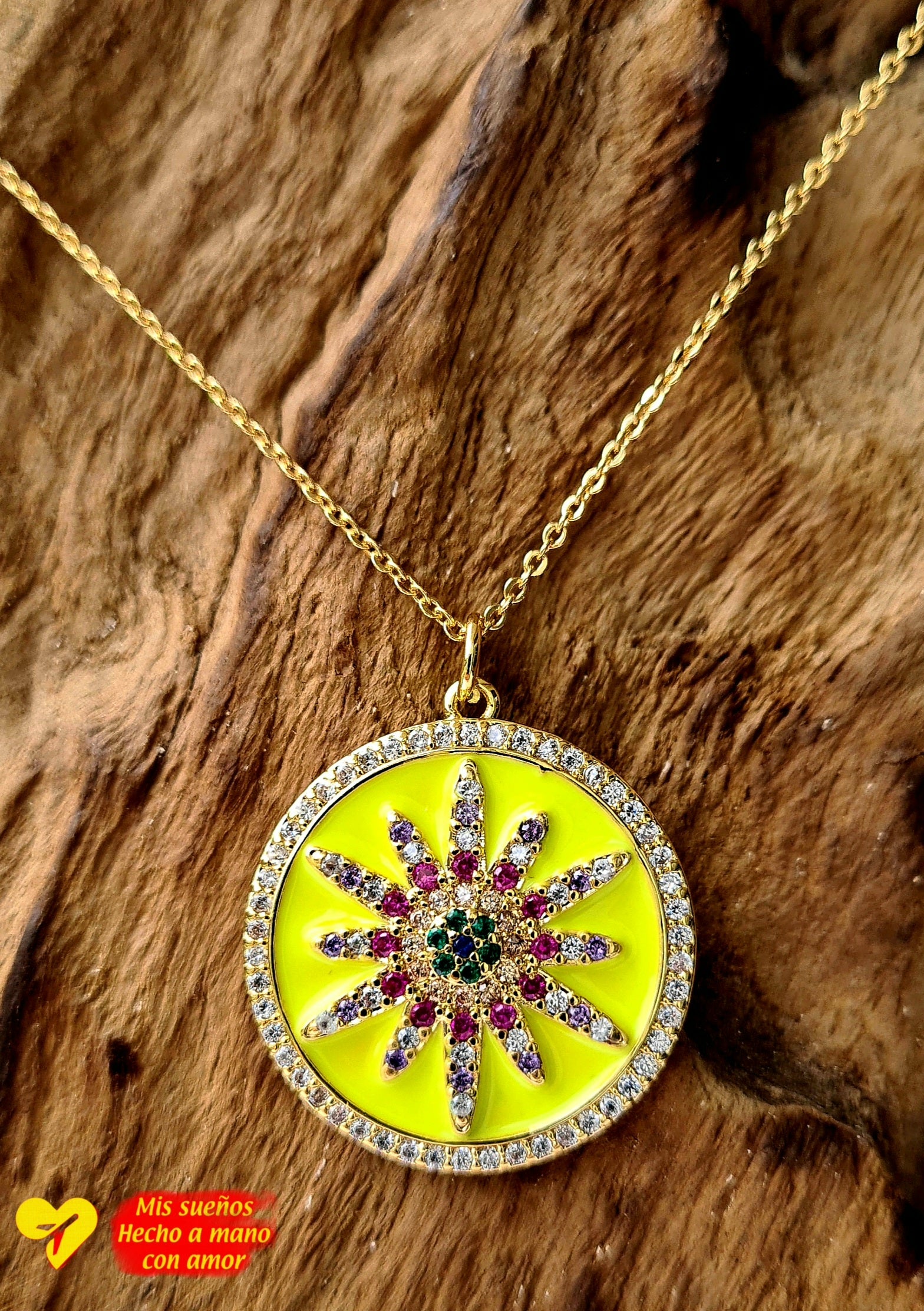 Ein wunderschöner Sonne Emaille Anhänger, an einer feinen goldenen Kette. Die Kette ist 50cm lang und in der Länge verstellbar. Sie besteht aus 925 Silber und ist 18 Karat vergoldet. Der Anhänger besteht aus Messing und ist 18 Karat vergoldet. Er wird von bunten Zirkonia Steinchen geziert.
