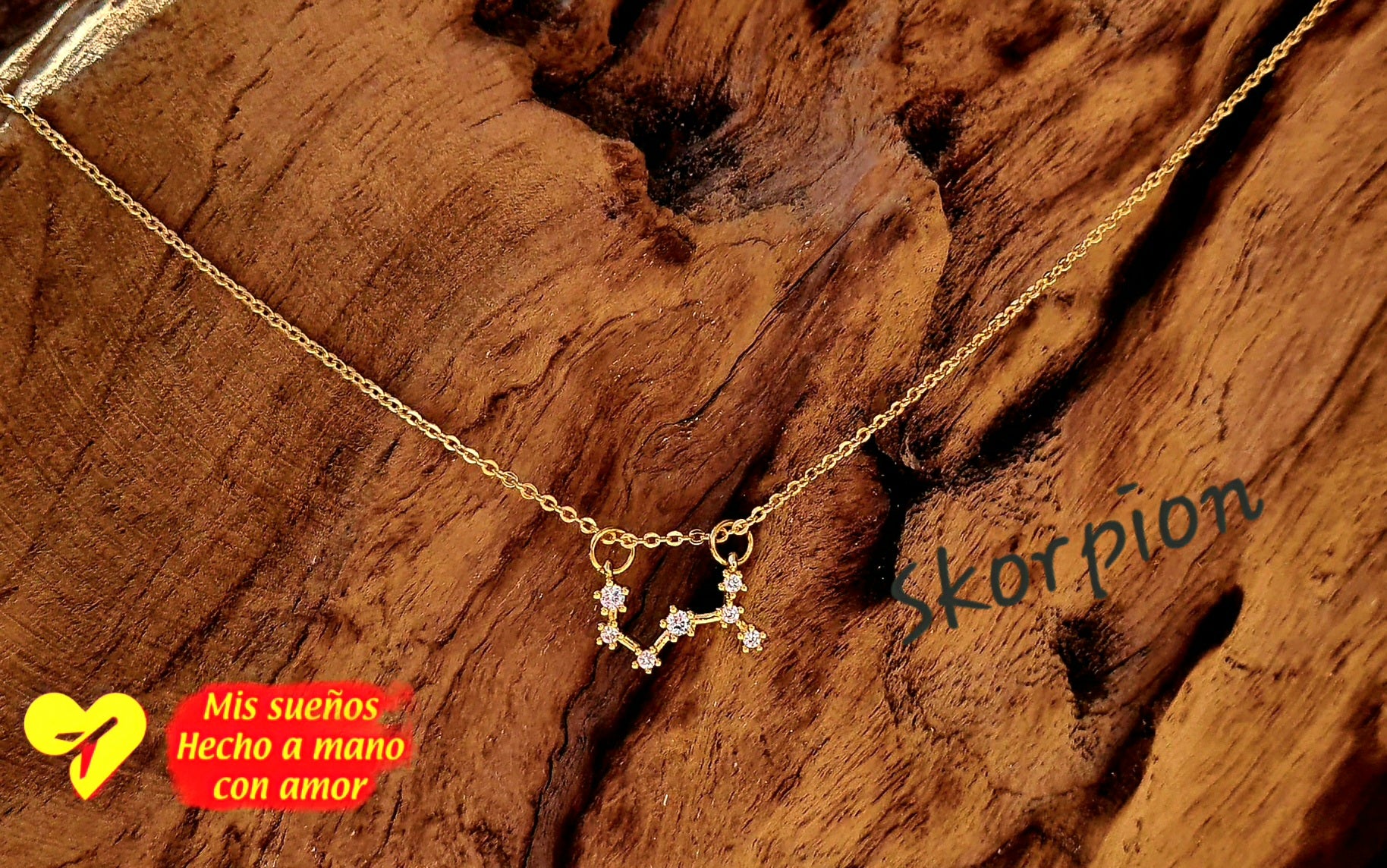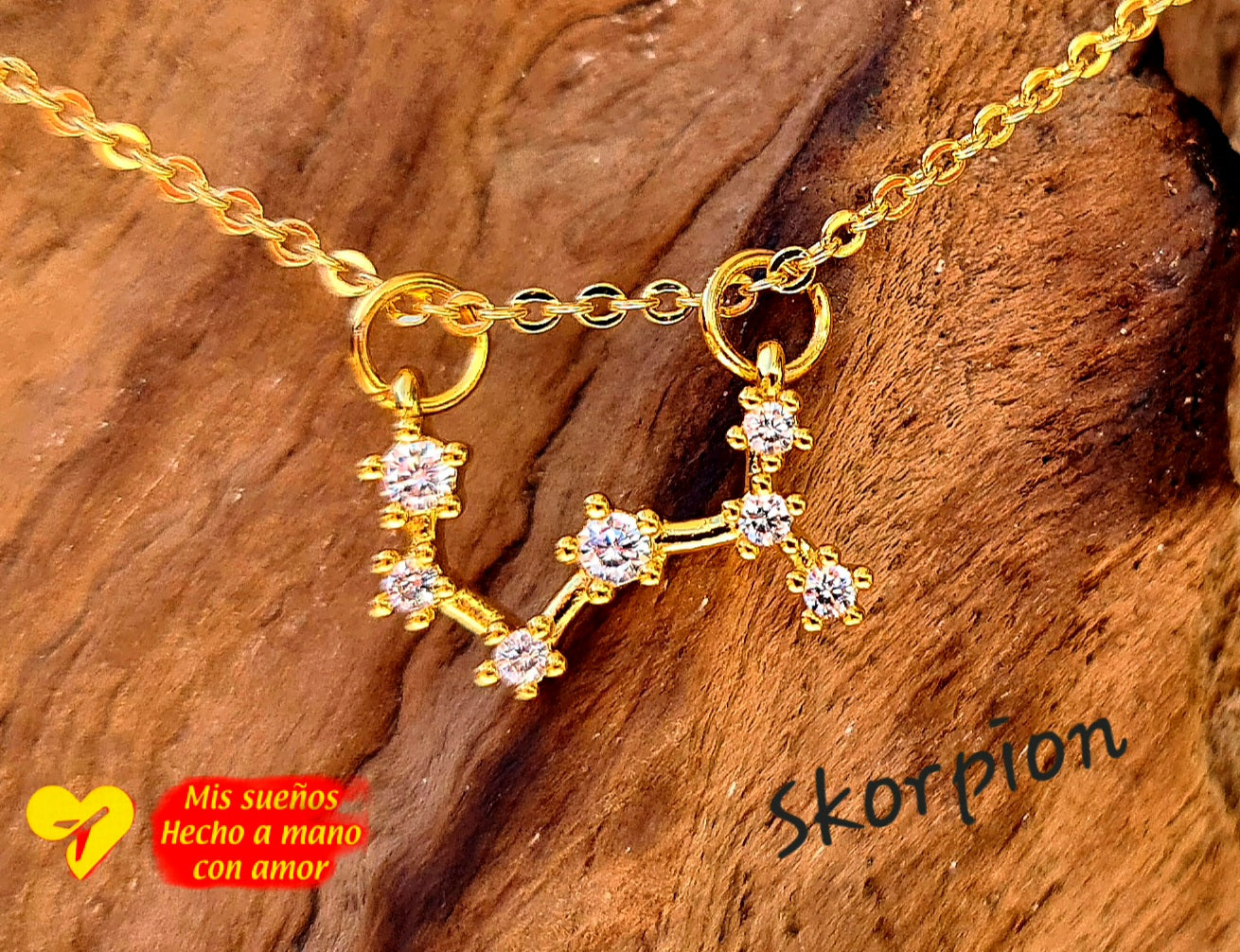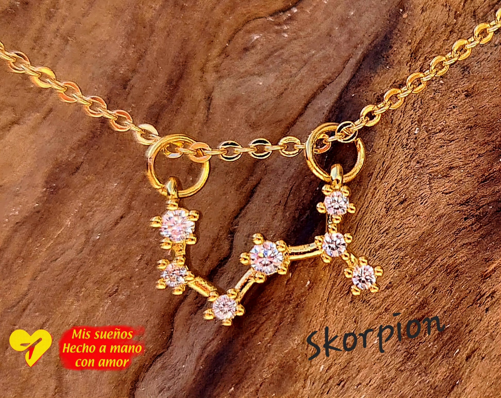 Ein wunderschöner Sternenbild (Skorpion) Anhänger, an einer feinen goldenen Kette. Die Kette ist 50cm lang und in der Länge verstellbar. Sie besteht aus 925 Silber und ist 18 Karat vergoldet. Der Anhänger besteht aus Messing und ist 18 Karat vergoldet. Er wird von kleinen Zirkonia Steinchen geziert.