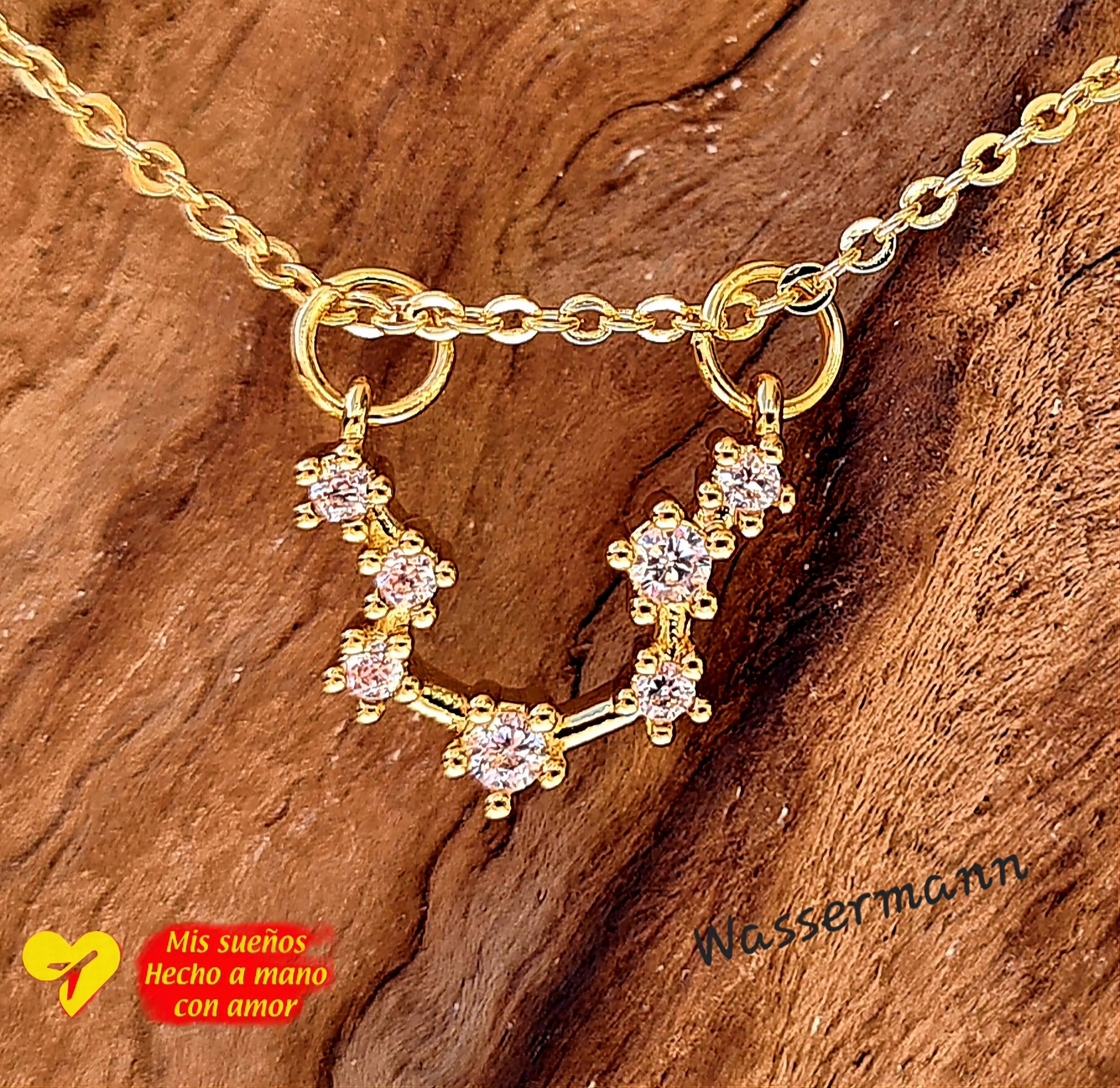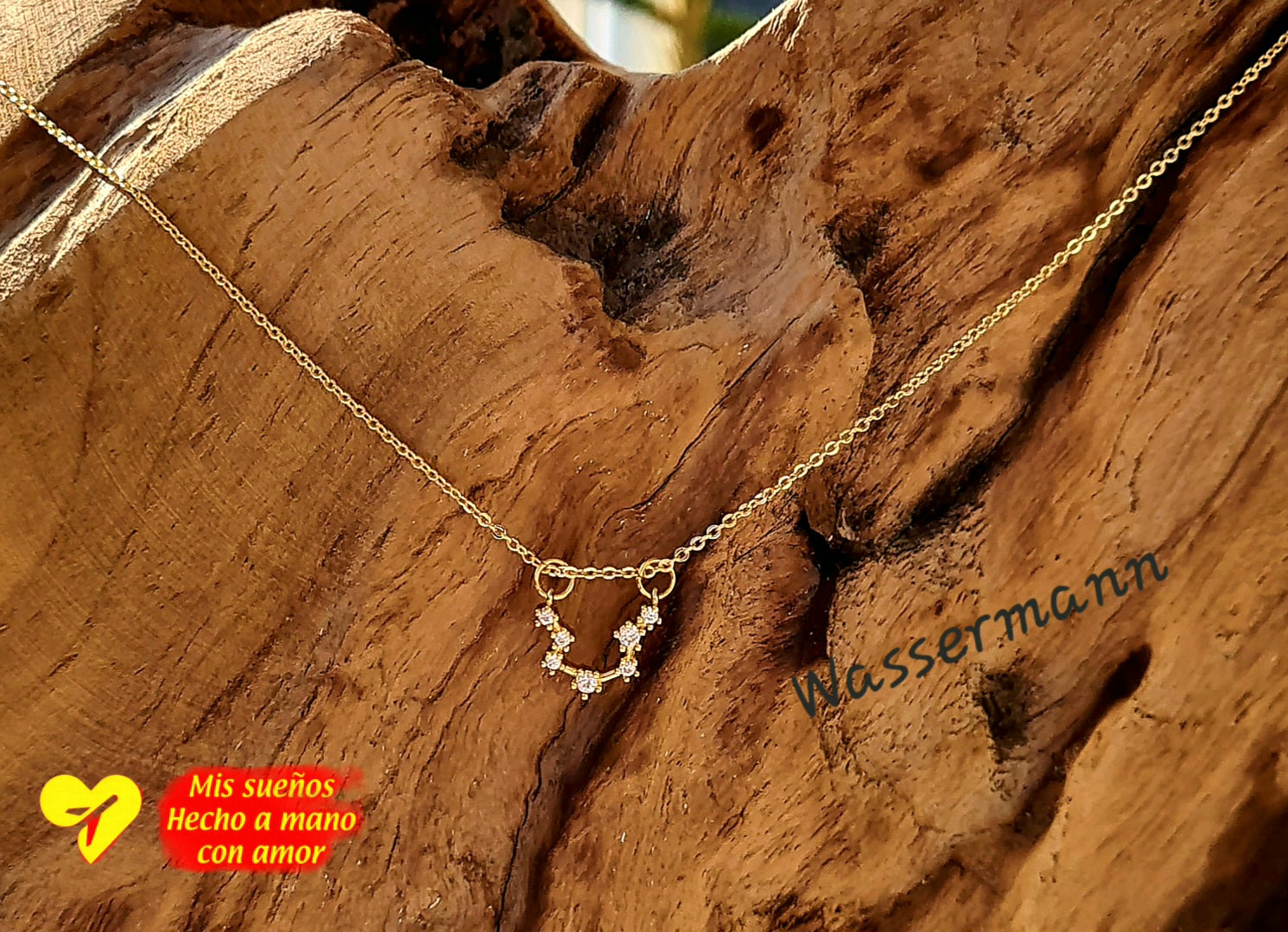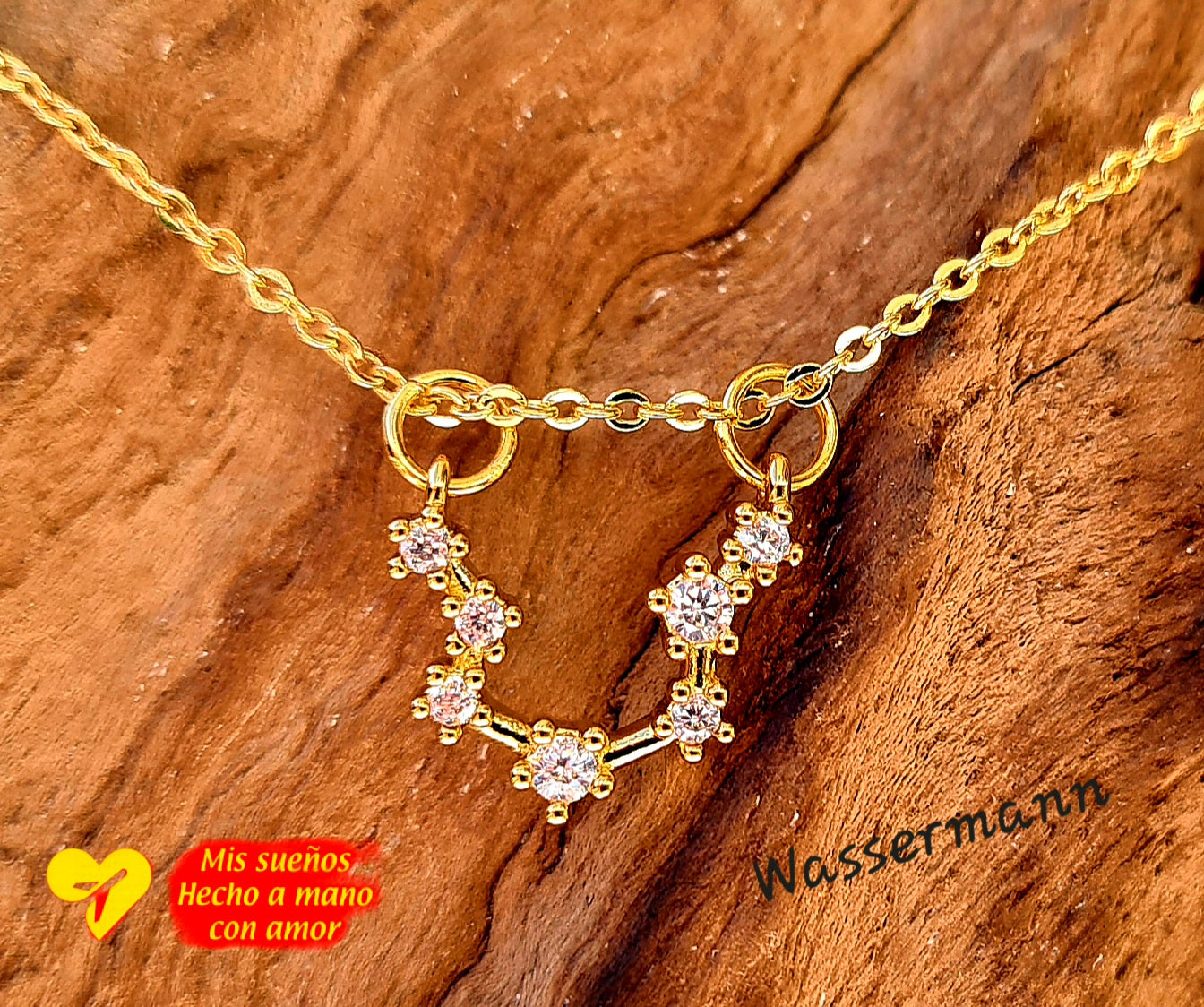 Ein wunderschöner Sternenbild (Wassermann) Anhänger, an einer feinen goldenen Kette. Die Kette ist 50cm lang und in der Länge verstellbar. Sie besteht aus 925 Silber und ist 18 Karat vergoldet. Der Anhänger besteht aus Messing und ist 18 Karat vergoldet. Er wird von kleinen Zirkonia Steinchen geziert.