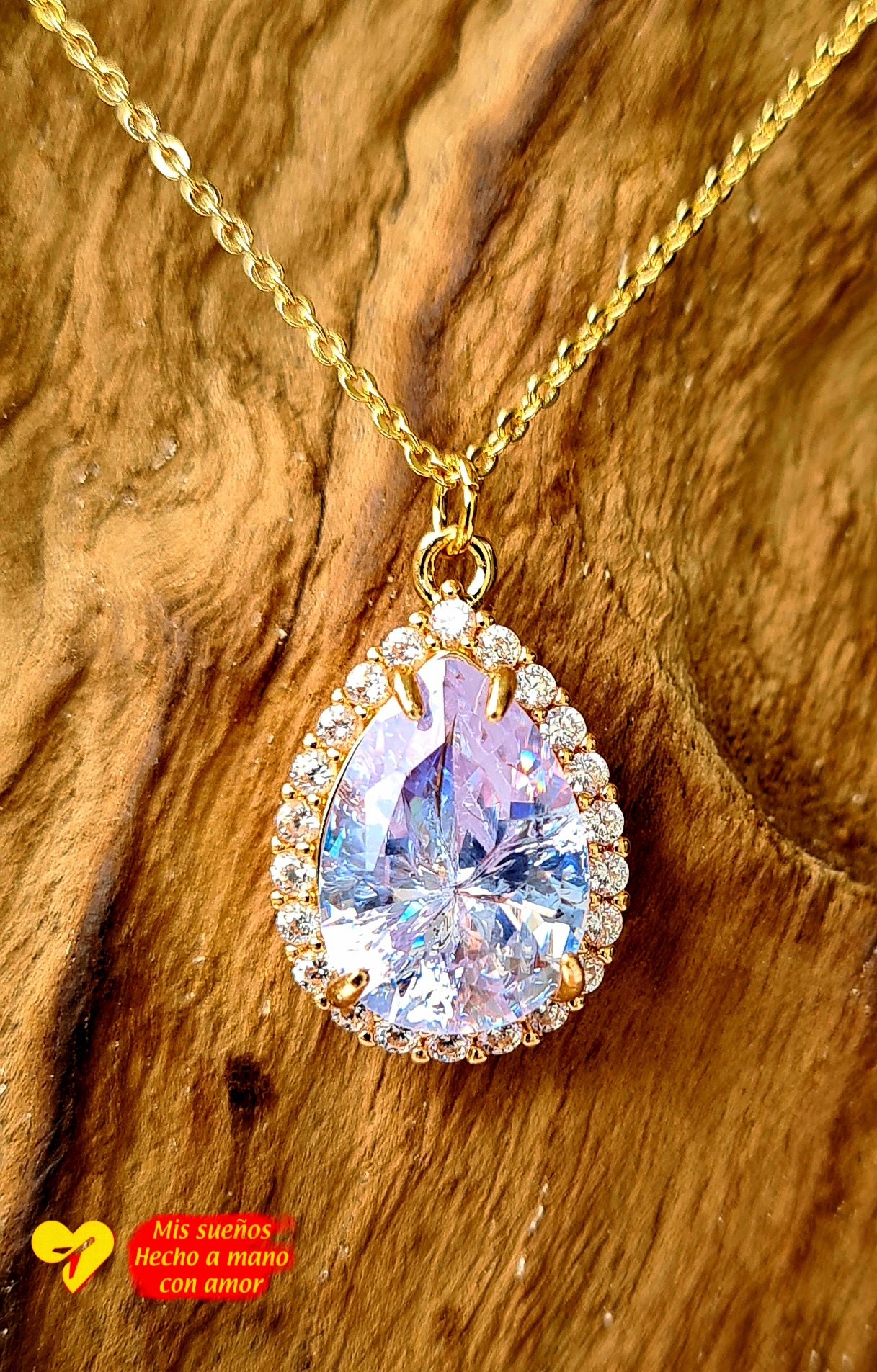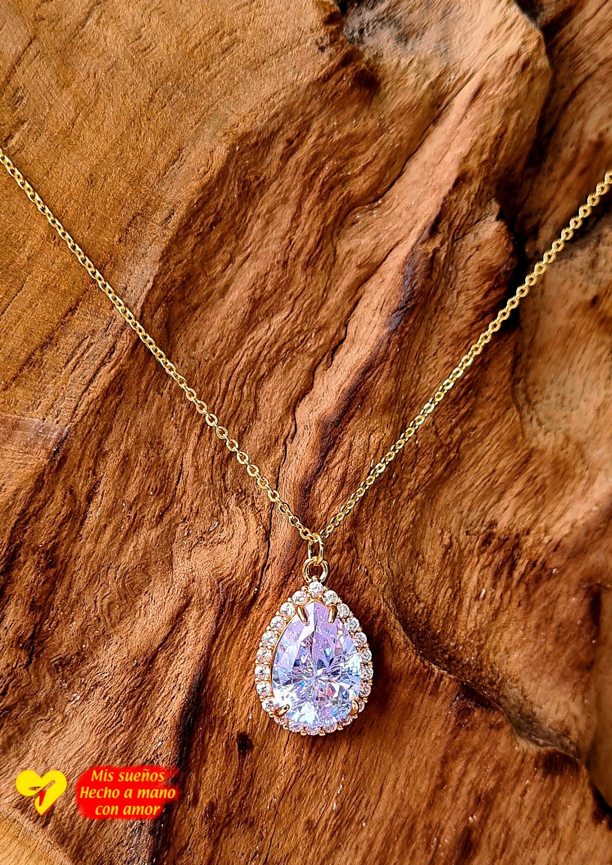 Ein wunderschöner Tropfen Anhänger, an einer feinen goldenen Kette. Die Kette ist 50cm lang und in der Länge verstellbar. Sie besteht aus 925 Silber und ist 18 Karat vergoldet. Der Anhänger besteht aus Messing und ist 14 Karat vergoldet. Er wird von einem großen und vielen kleinen Zirkonia Steinen geziert.