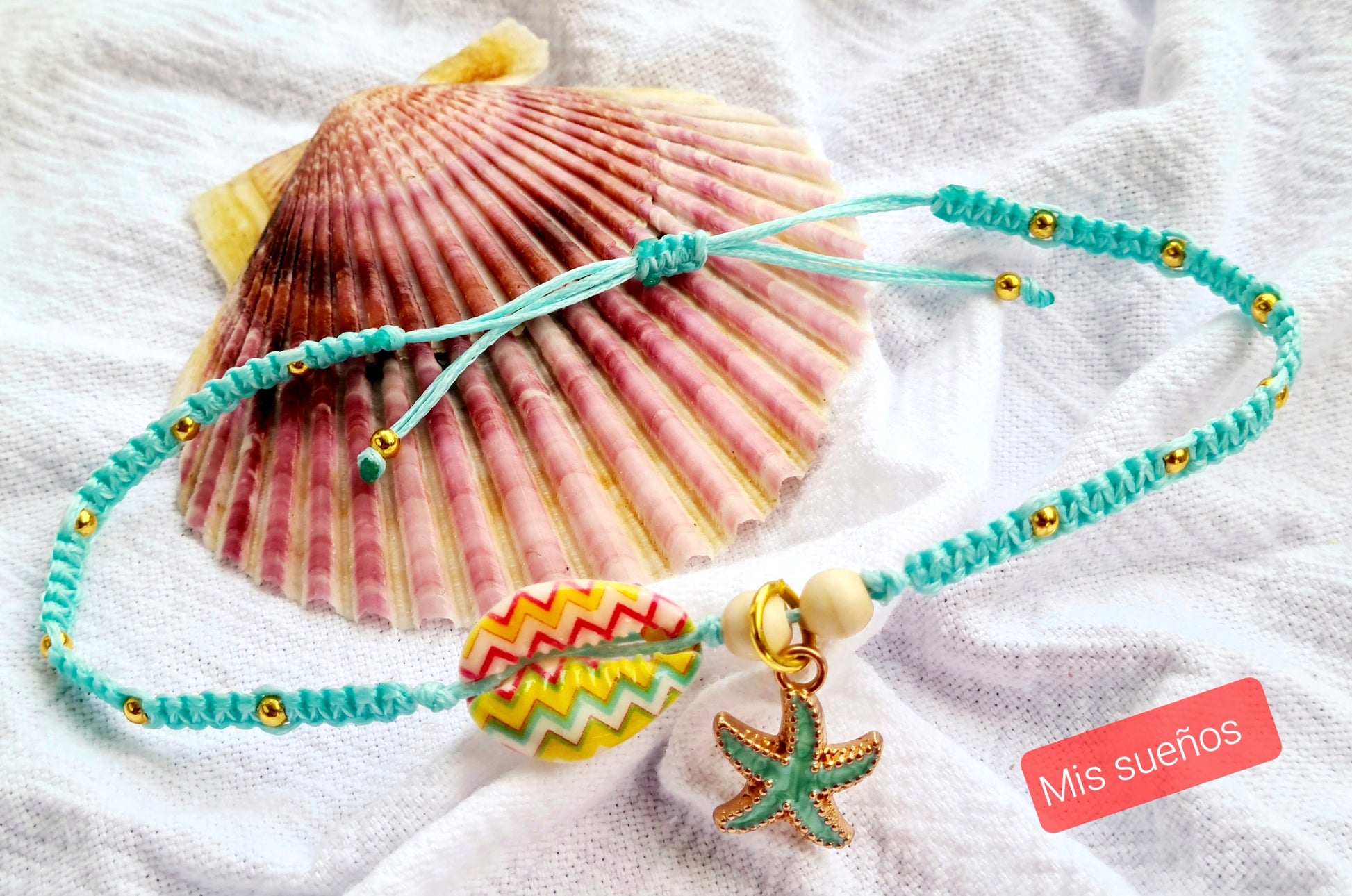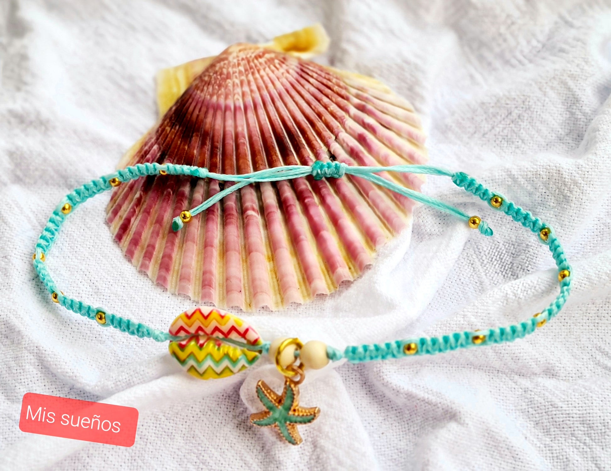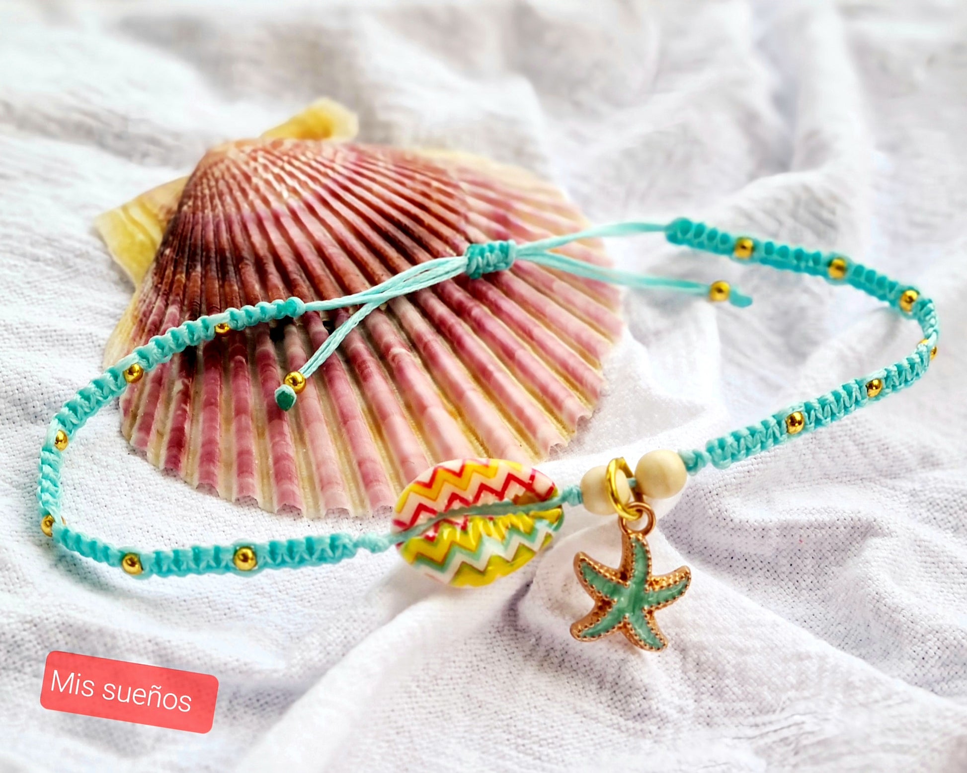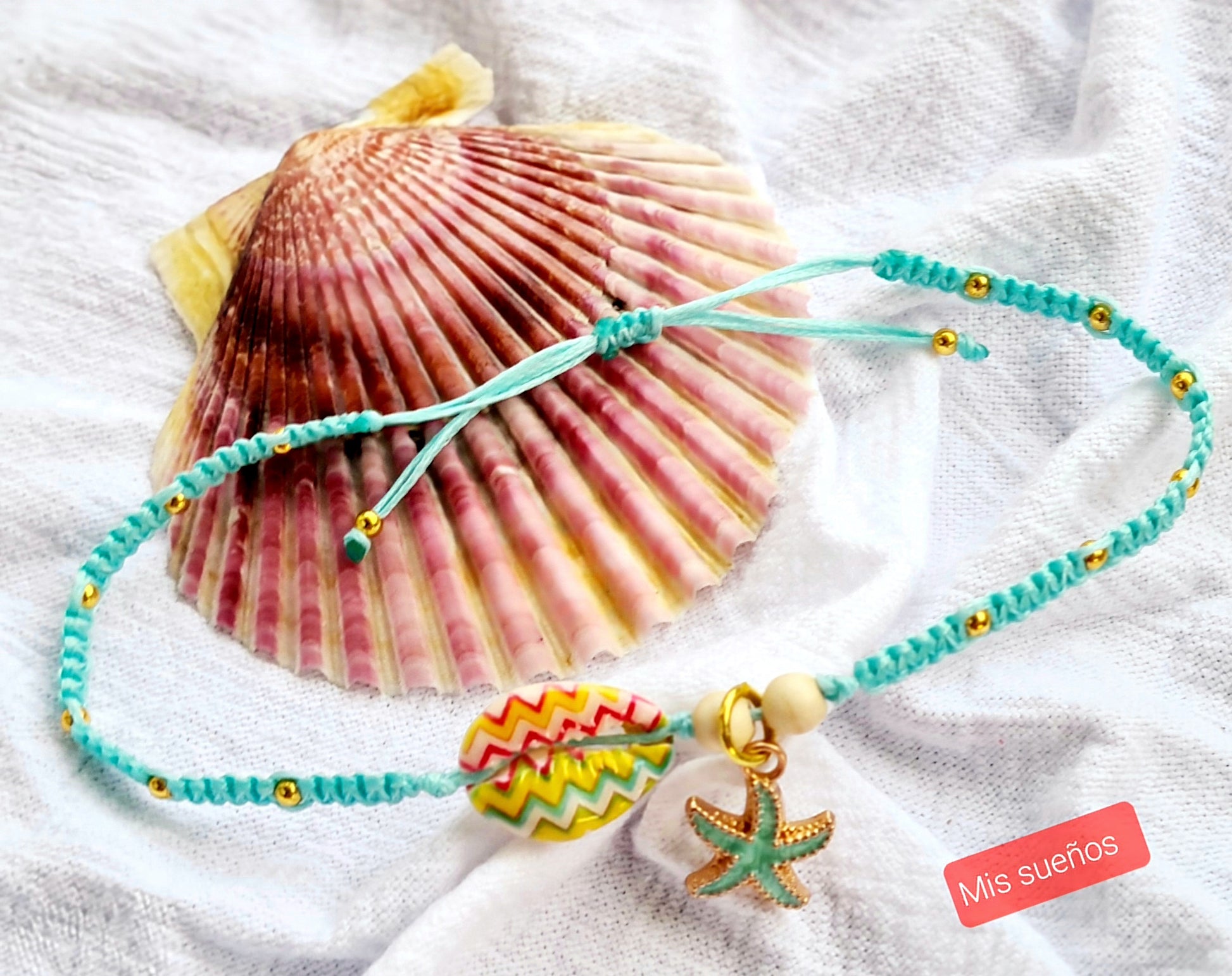 Das Fußkettchen "Vacaciones" vermittelt ein Hauch von Urlaub. Es besitzt eine lockere Makramee-Struktur. In die feine Handarbeit sind goldfarbene Metallperlen eingearbeitet. Geziert wird das ganze mit einer bunt verzierten Kaurimuschel und einem Seestern-Anhänger. Es besitzt einen Makramee-Zugverschluss.